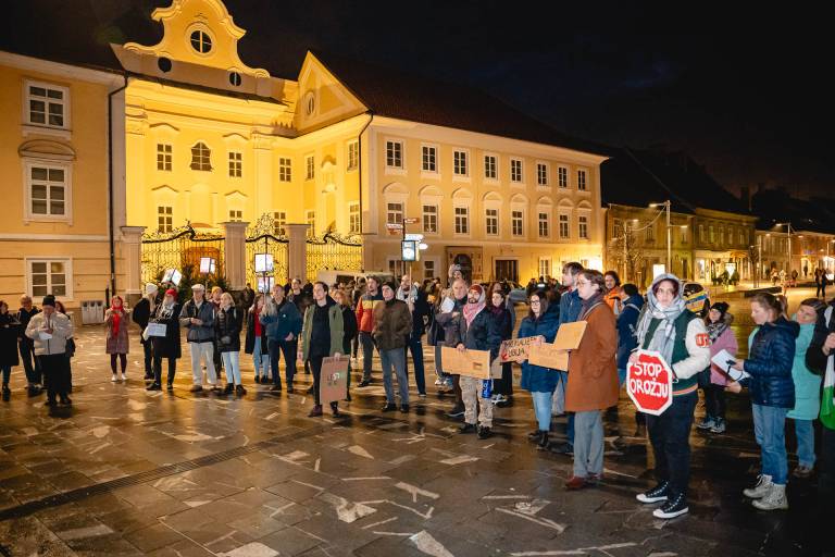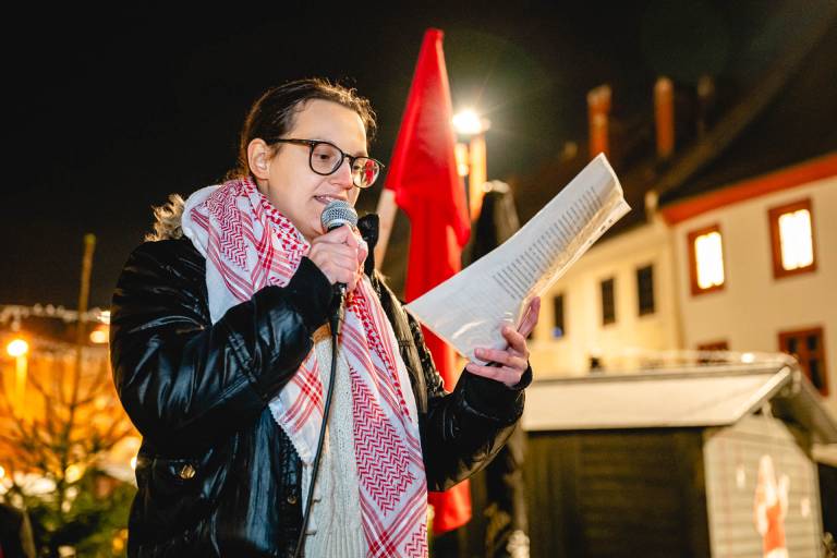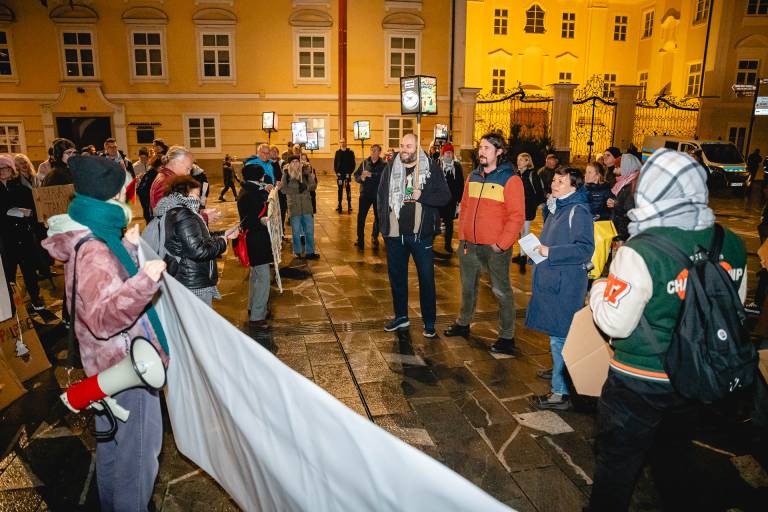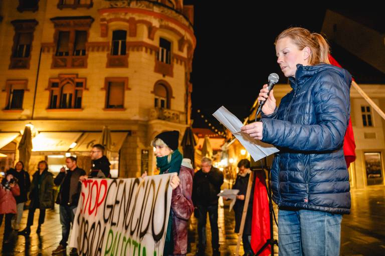 »Kako naj opišem to, da vsak dan začnem s preverjanjem, ali so moja mama, moji bratje, moji mali nečaki in nečakinje še živi ali ne, ali so dan prej uspeli najti kaj hrane, ali jim je bilo ponoči v šotoru prehladno,« je svoje misli na protestu delila Wafa Kanaan, Palestinka iz Gaze, ki živi v Sloveniji.