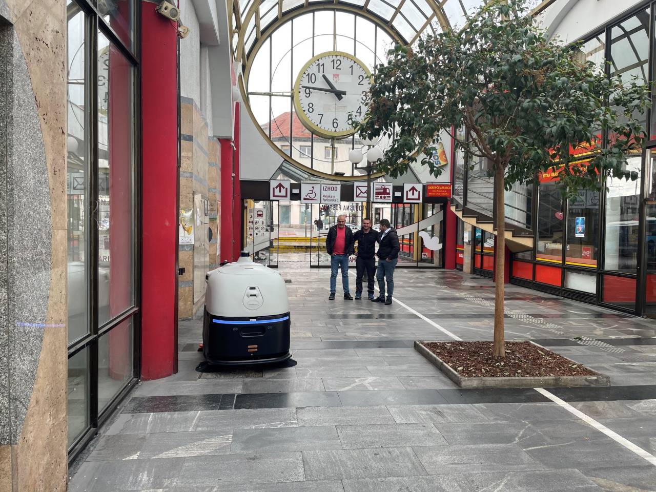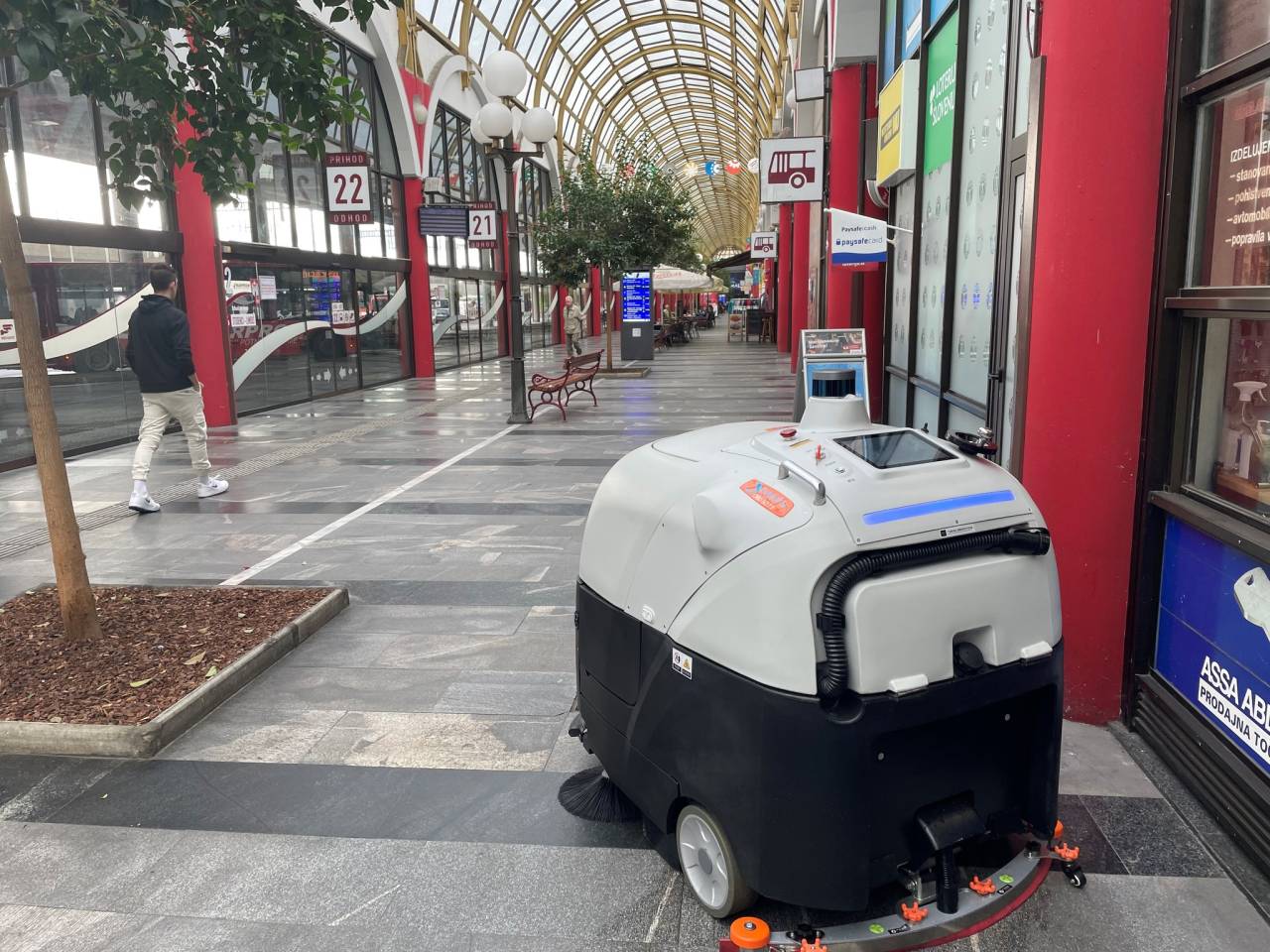 Med pripomočki za vsakodnevno čiščenje pokritega hodnika glavne avtobusne postaje je po novem testno tudi električni čistilni robot Vigo SC80.