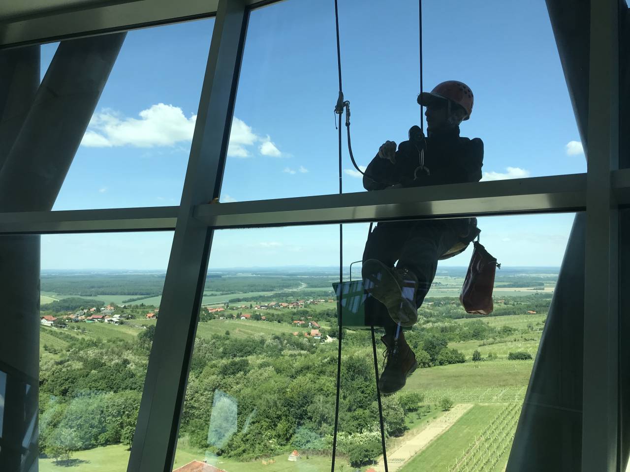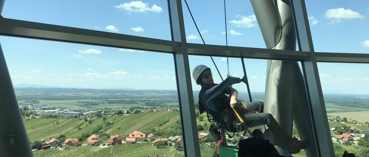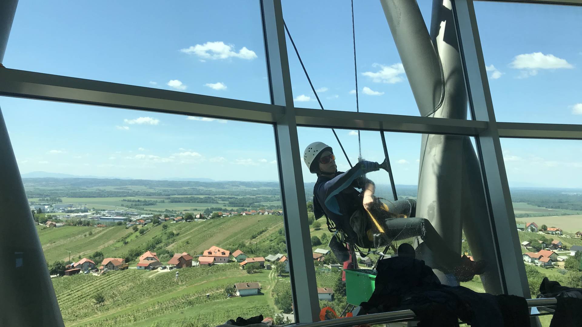 Za čiščenje zunanjih steklenih površin razglednega stolpa Vinarium v Lendavi je potrebnega kar nekaj poguma.
