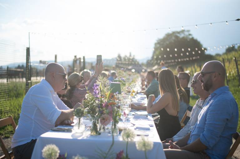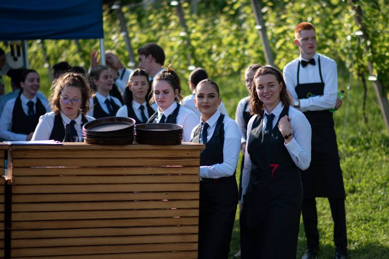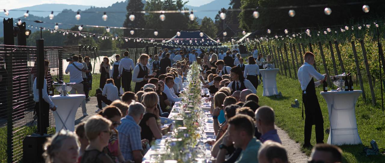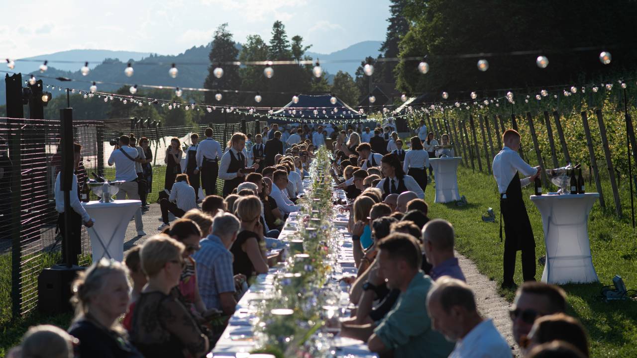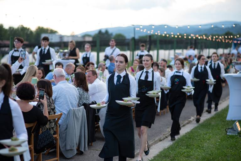 Pod vinogradom potomk Najstarejše trte na svetu je omizju s 150 gosti postreglo okoli 80 študentov in dijakov mariborskih šol za gostinstvo in turizem, ki so v okviru dogodka ustvarili prvovrstno vinsko-kulinarično doživetje ter z njim opozorili na svoje kompetence in potenciale v gostinstvu in turizmu.