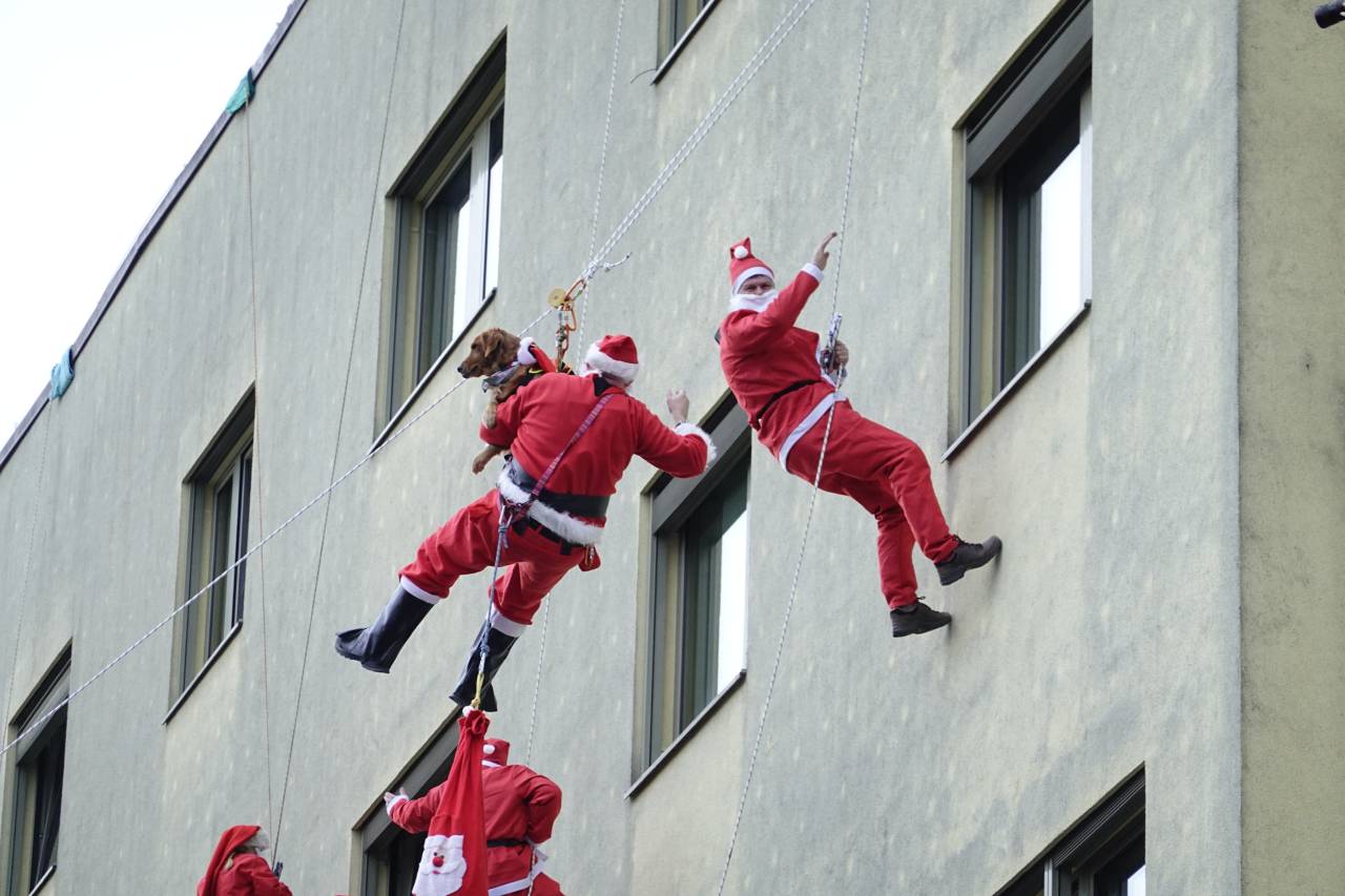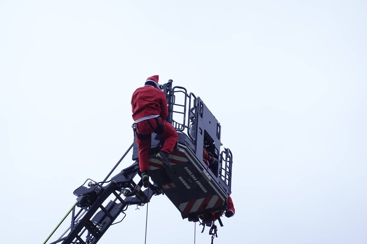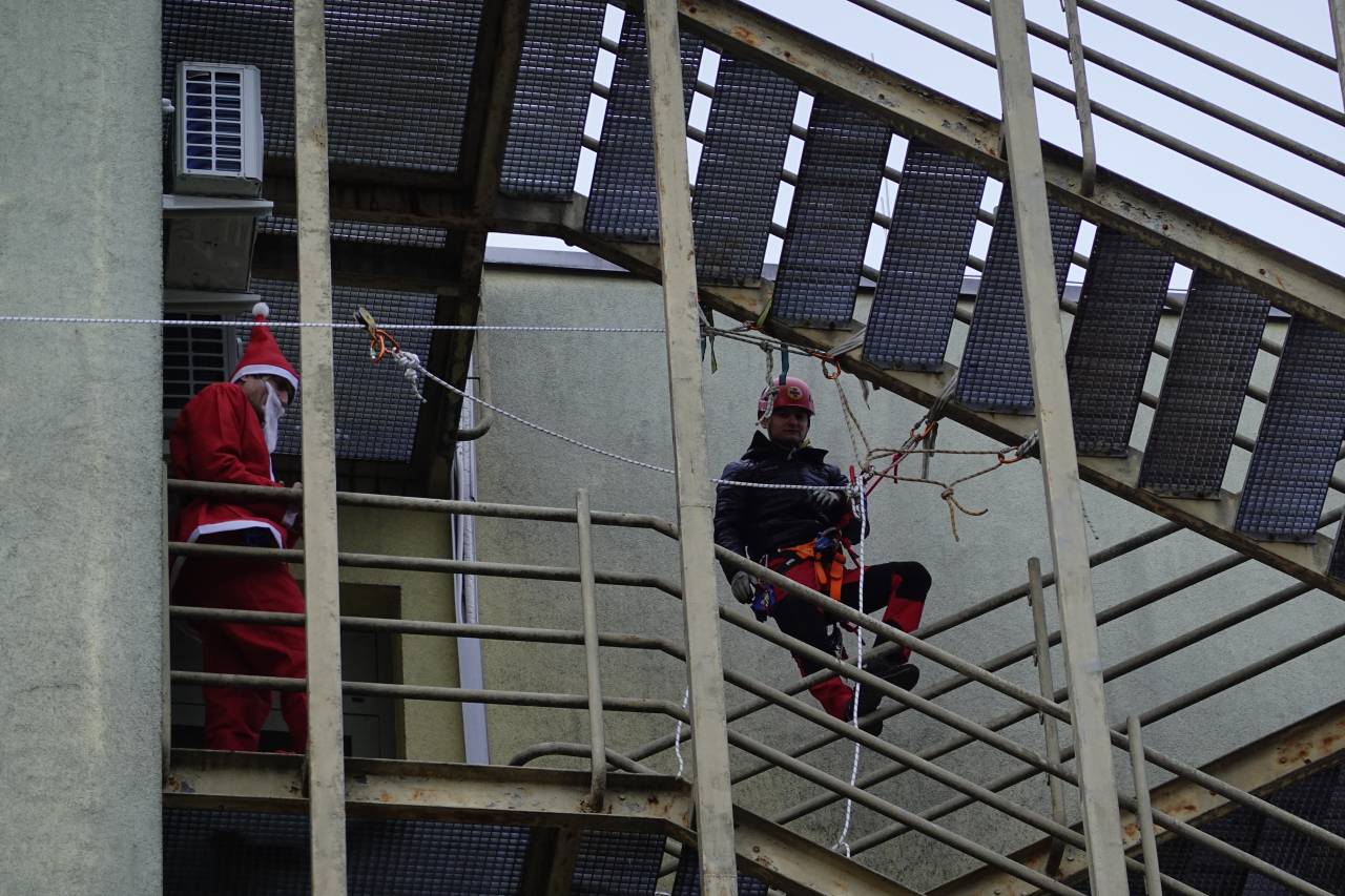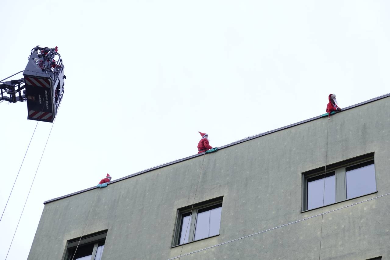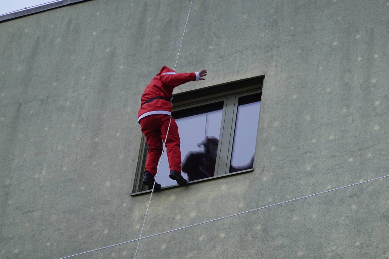 Možje v rdečem so tudi letos s spustom s strehe stavbe Klinike za pediatrijo v Univerzitetnem kliničnem centru Maribor ponovno razveselili hospitalizirane otroke.