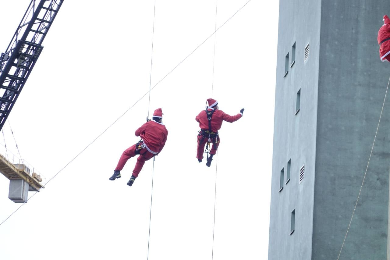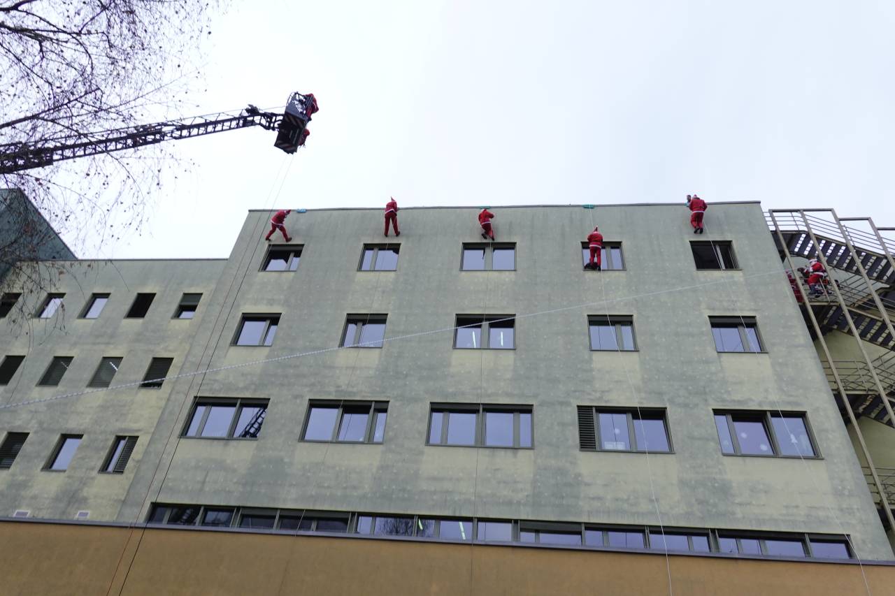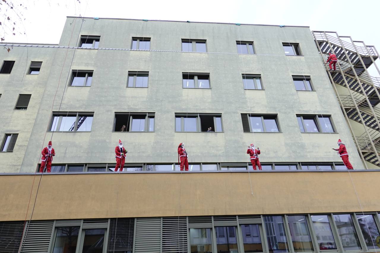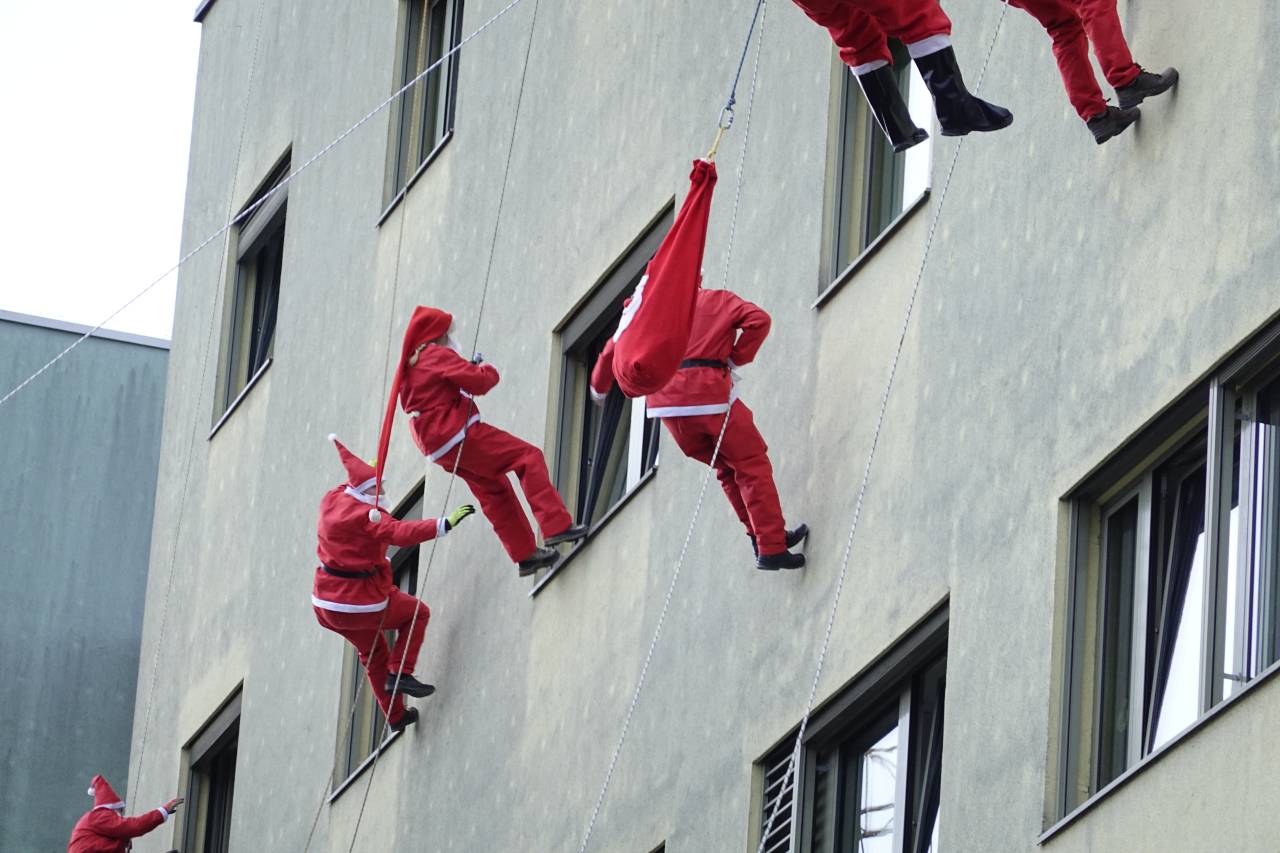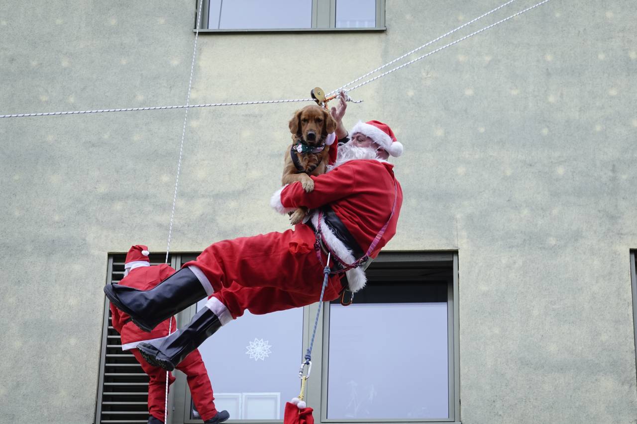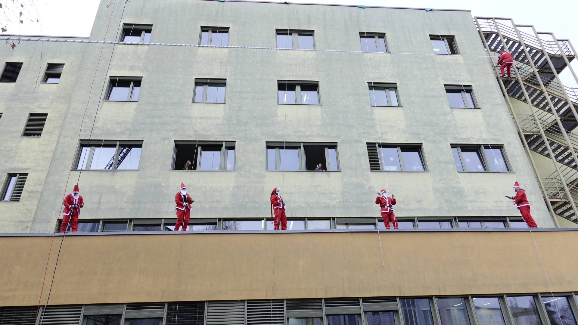 Možje v rdečem so tudi letos s spustom s strehe stavbe Klinike za pediatrijo v Univerzitetnem kliničnem centru Maribor ponovno razveselili hospitalizirane otroke.