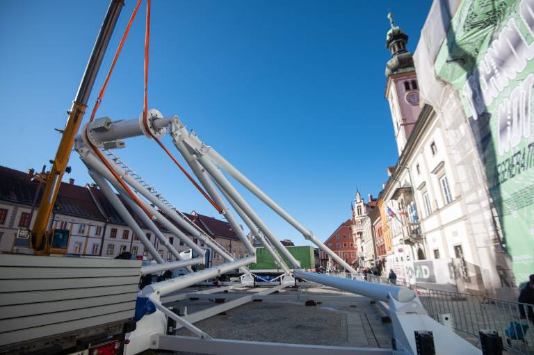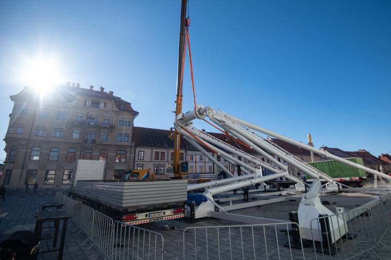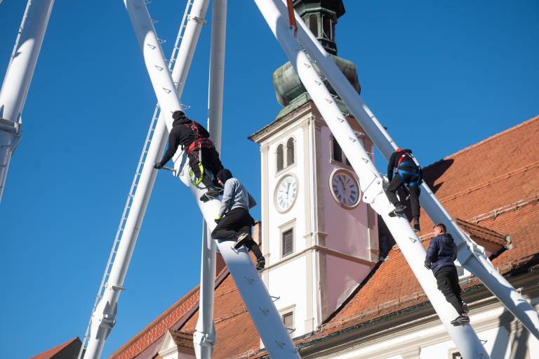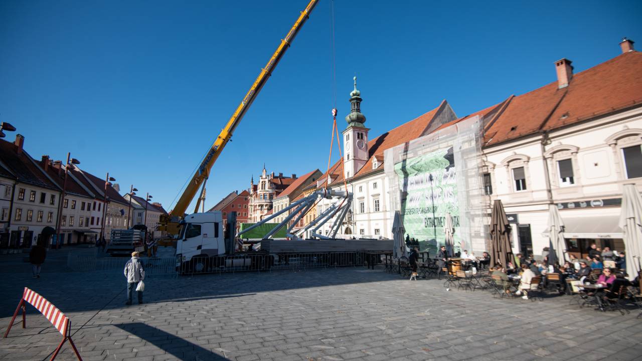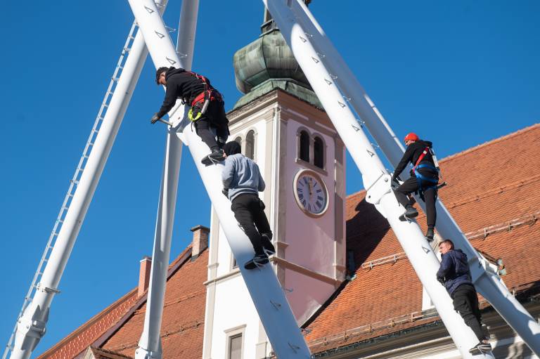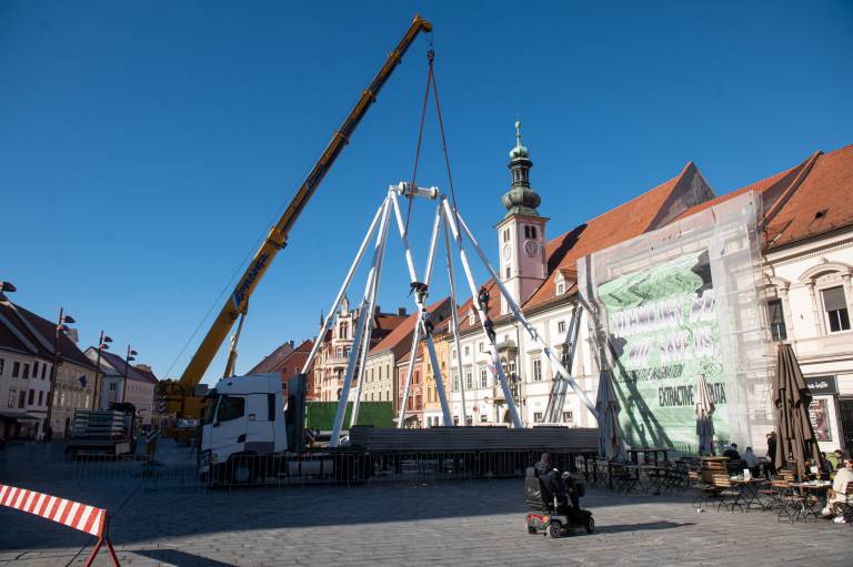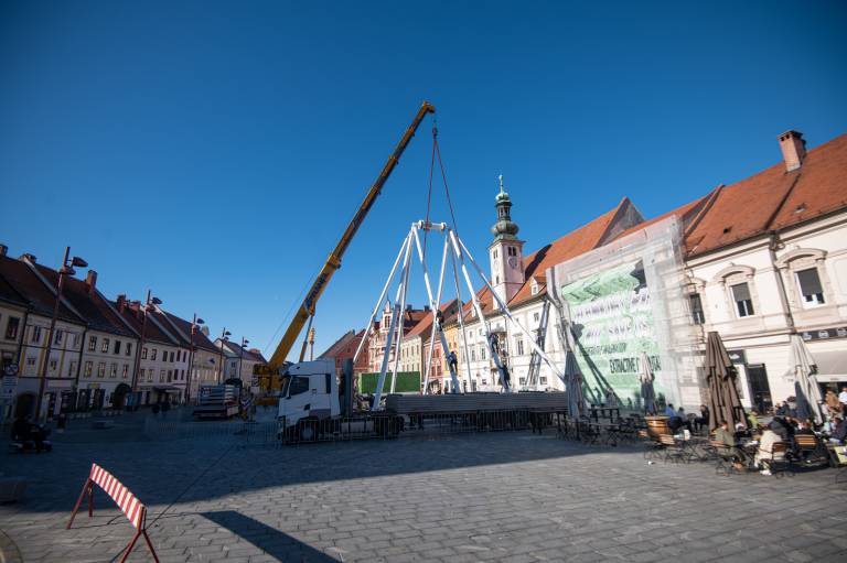 Na Glavni trg v Mariboru je prispel konvoj tovornjakov. Gre za dostavo delov panoramskega kolesa, ki je bilo tudi lani del praznične ponudbe. Danes so začeli s postavljanjem.