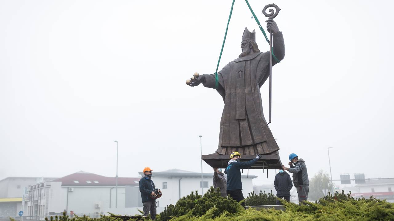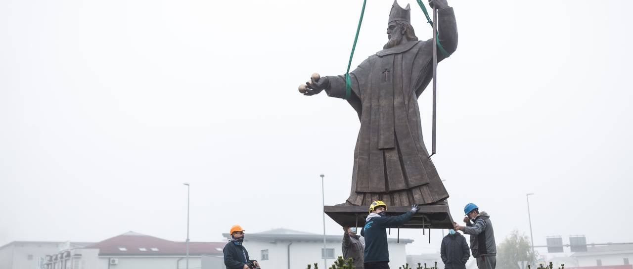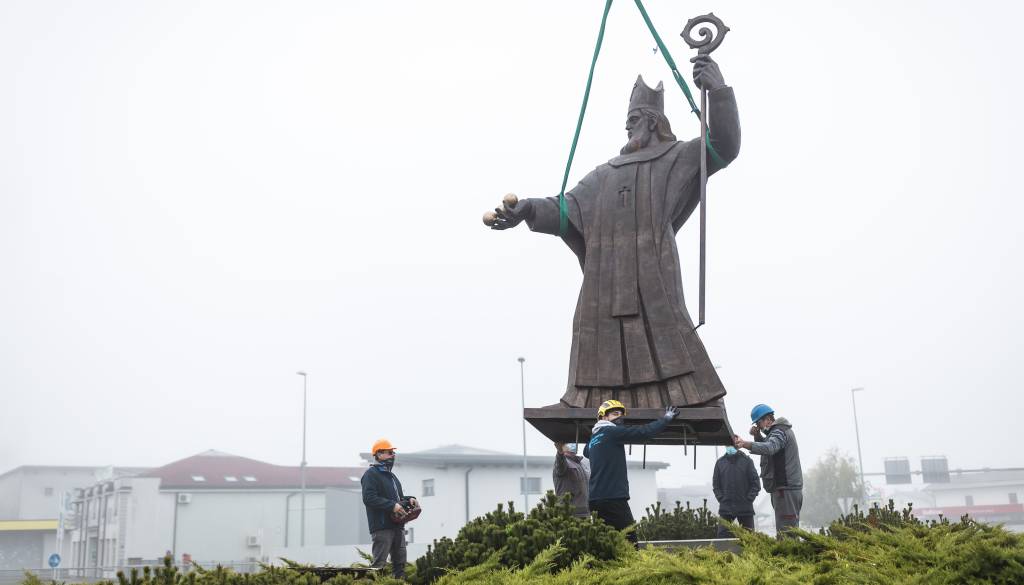 V krožišču pri stolni cerkvi v Murski Soboti so danes postavili kip svetega Nikolaja.