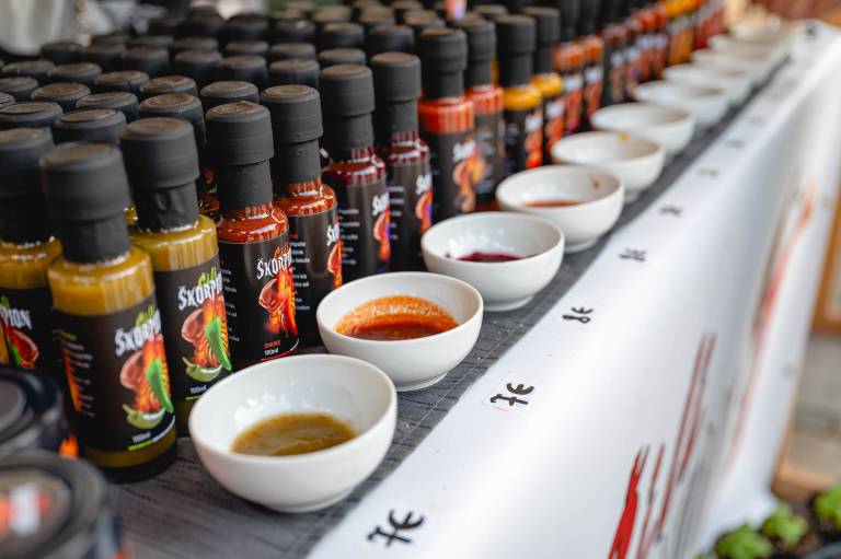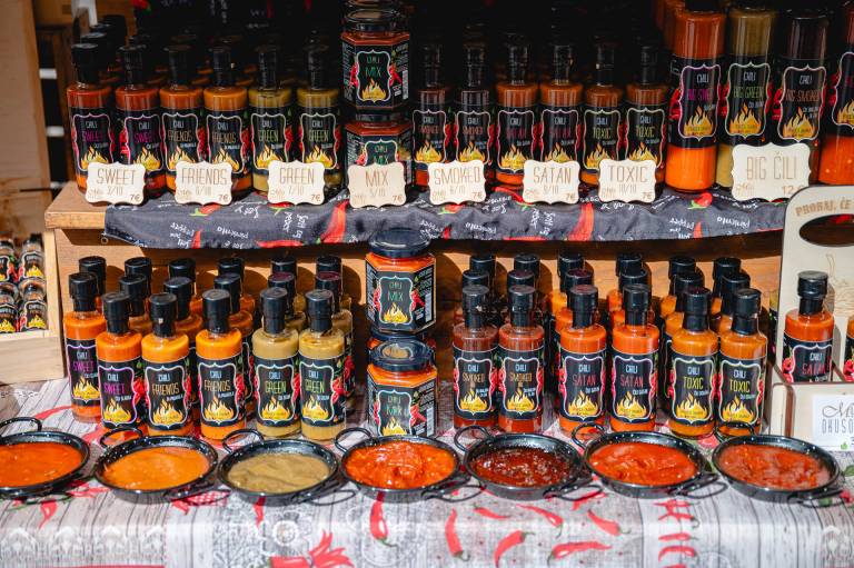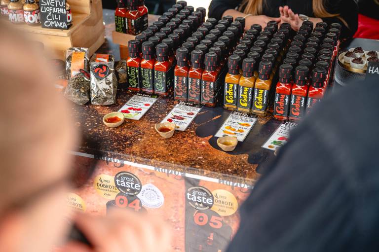 Tudi letos je svoje izdelke na stojnice postavilo več kot 30 slovenskih in tujih ponudnikov, organizatorji pa niso pozabili na zdaj že tradicionalna tekmovanja v čili omakah, jedenju pekočih perutničk in hitrostnem jedenju čokolade, ki se bodo odvila jutri popoldan.