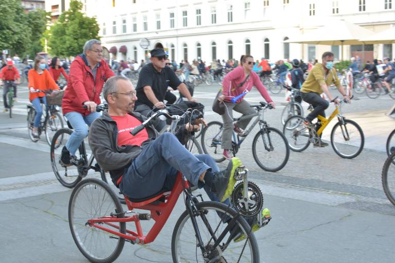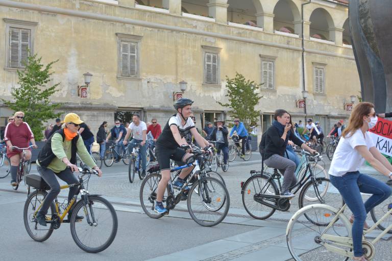 Kot je za petke zdaj že v navadi, so se tudi danes protestniki zbrali v večjih slovenskih mestih in s kolesarjenjem izražali svoje nestrinjanje s trenutno vlado. Po tem ko je je bilo prejšnji teden v oblačnem vremenu v Mariboru nekoliko manj protestnikov, se je danes spet zbrala večja množica.