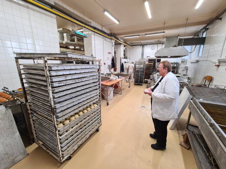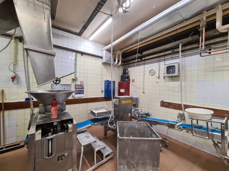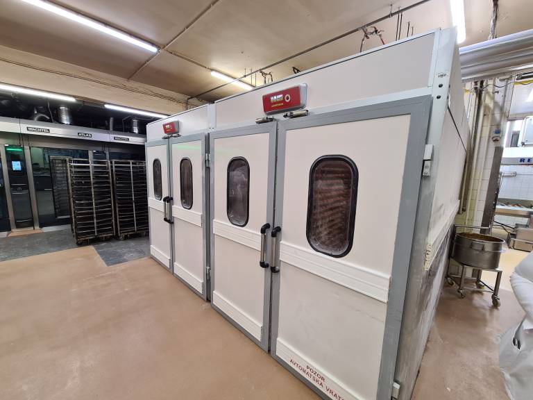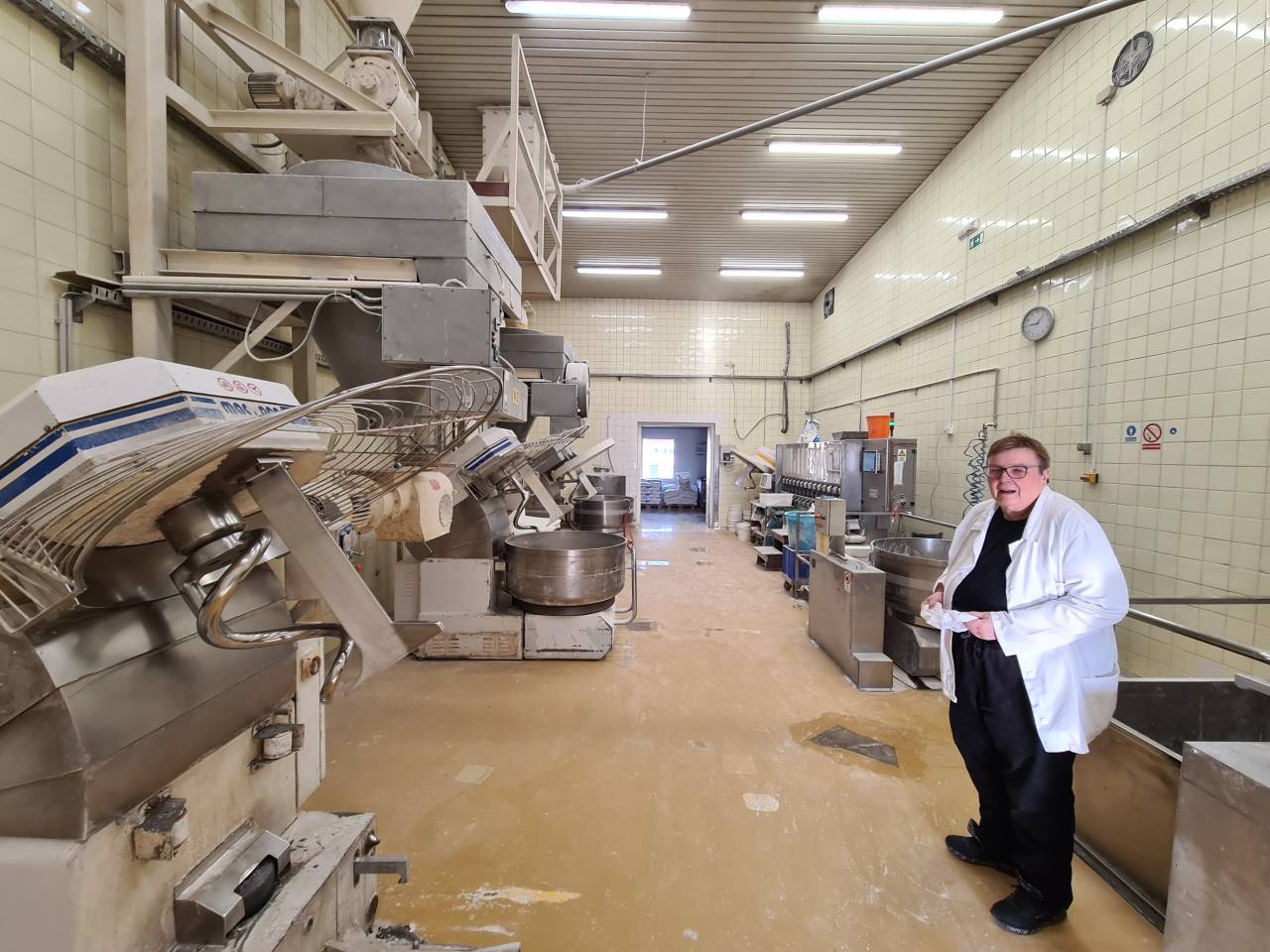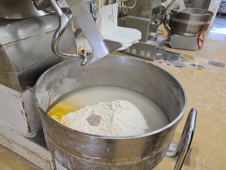 V prvem nadstropju pekarne se v mešalnici pripravi testo v posebnih posodah, ki lahko sprejmejo do sto kilogramov moke.