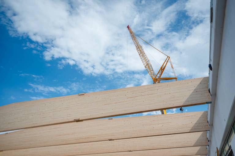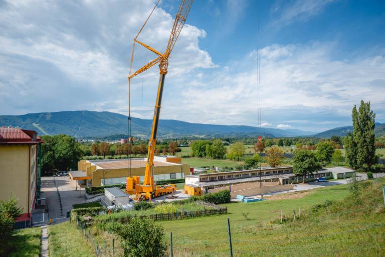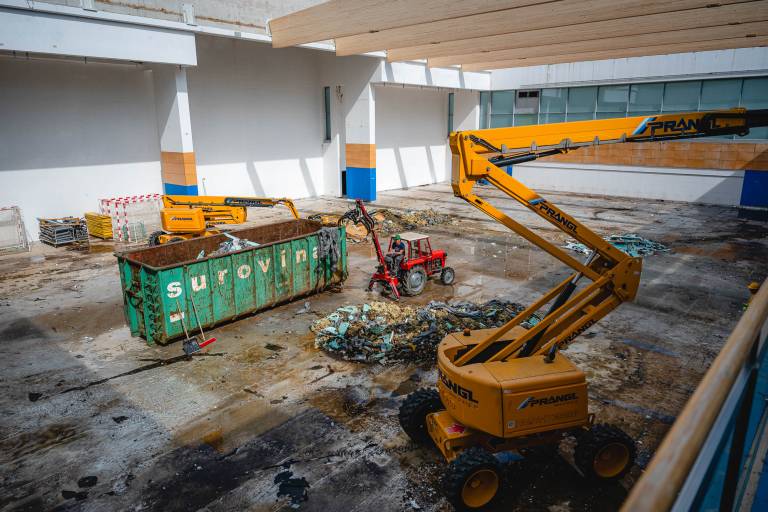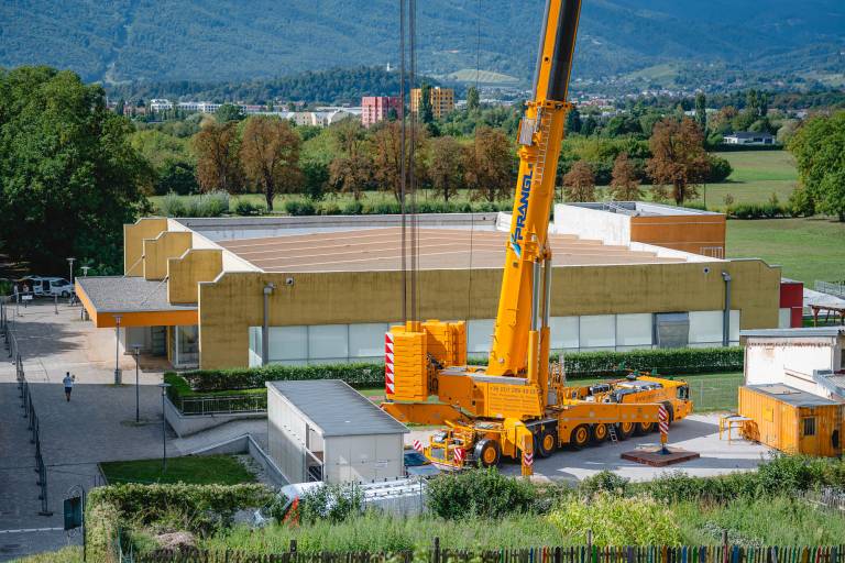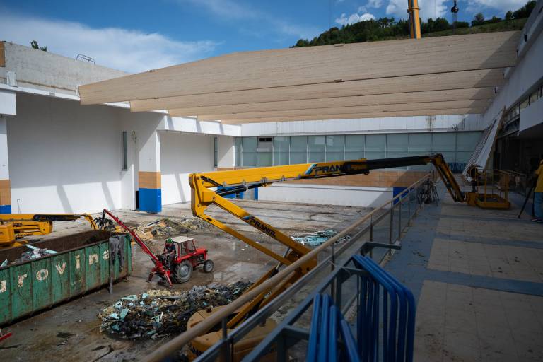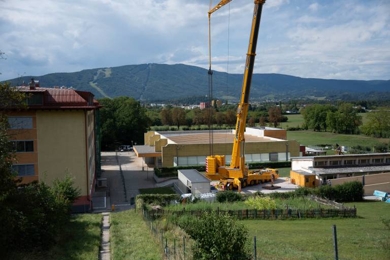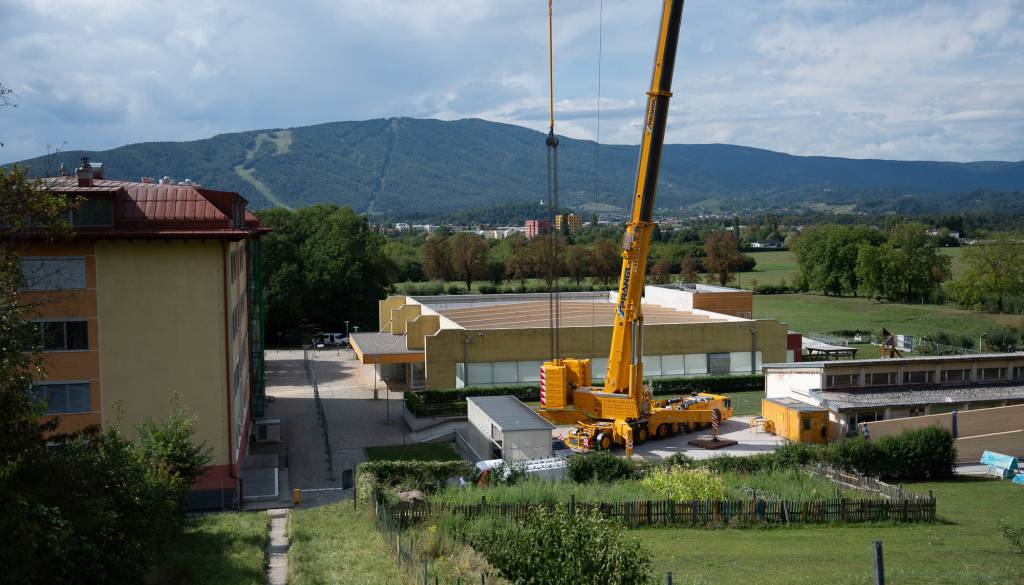 V ponedeljek so na gradbišče pripeljali prve nosilce za novo strešno konstrukcijo, danes pa je delo že v polnem teku.