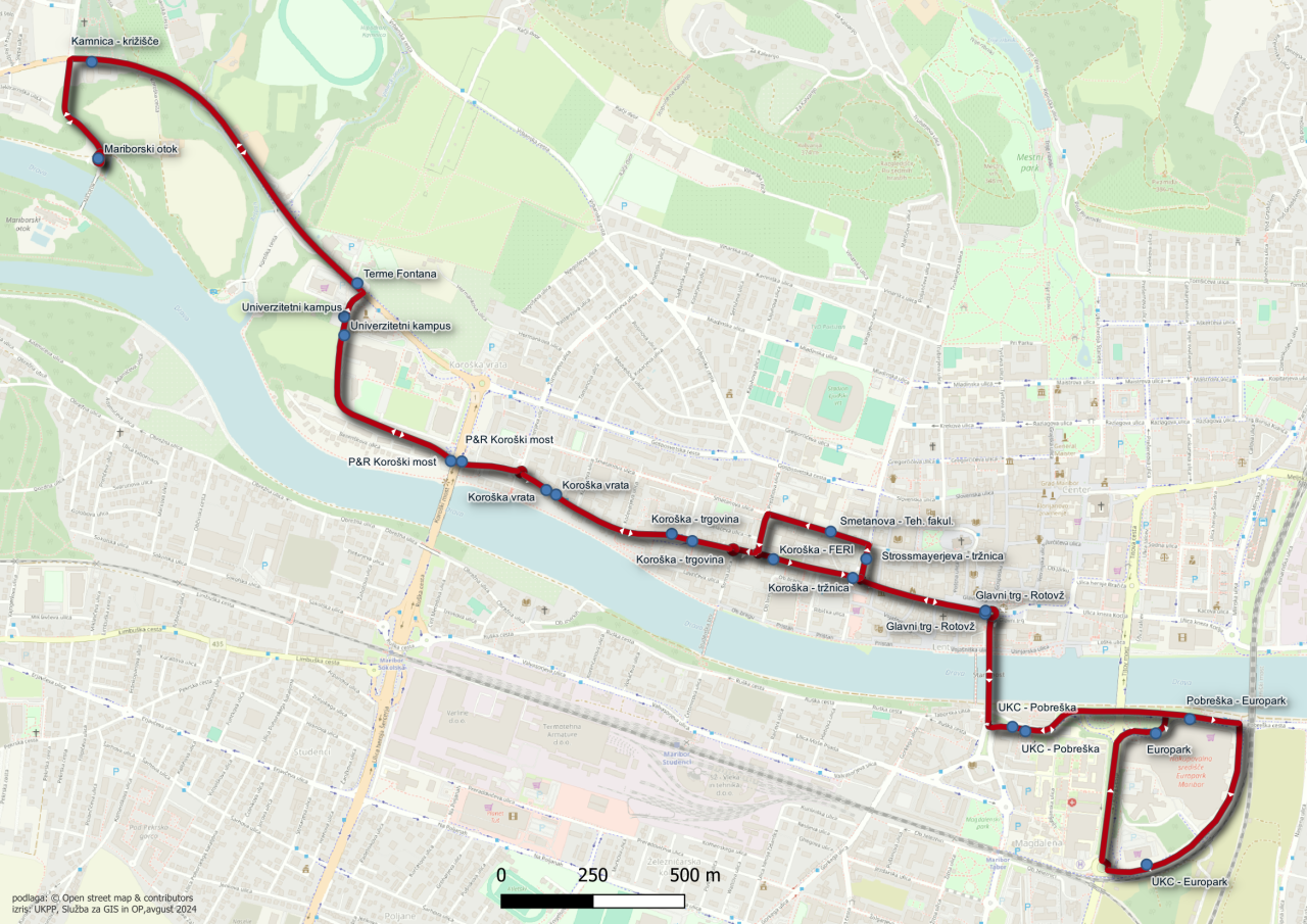 Postajališča nove glavne avtobusne linije v smeri vzhod – zahod so: Pobreška Europark – Pobreška rondo – Europark – Magdalena – Glavni trg Rotovž – Strossmayerjeva tržnica – Tehniška fakulteta – (v smeri zahod – vzhod Koroška Fakulteta za elektrotezniko, računalništvo in informatiko ter Koroška tržnica) – Koroška trgovina – Koroška vrata – P & R Koroški most – Študentski kampus vhod.