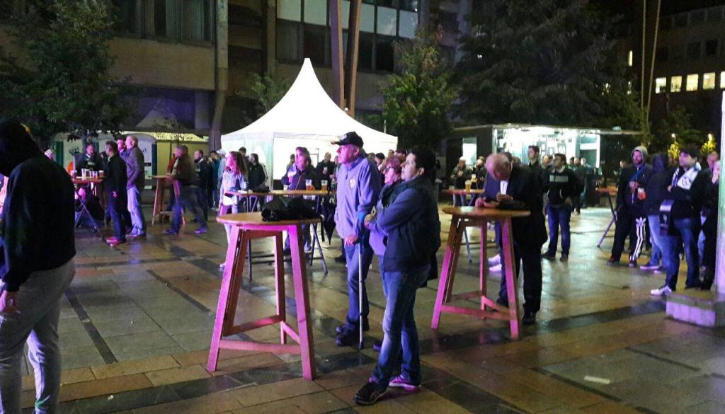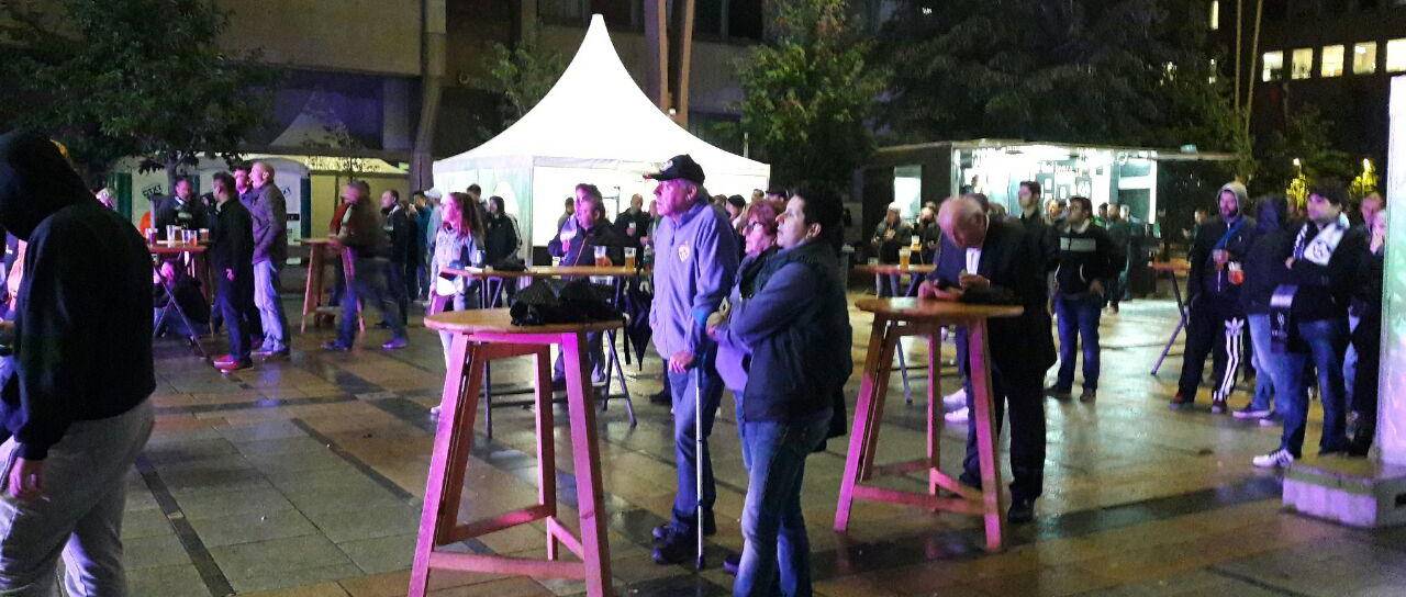 Ne le 250 navijačev na stadionu v Sevilli in vsi ostali pred televizijskimi sprejemniki, tudi na Trgu Leona Štuklja dežju kljubuje manjša množica zvestih navijačev vijoličaste čete.