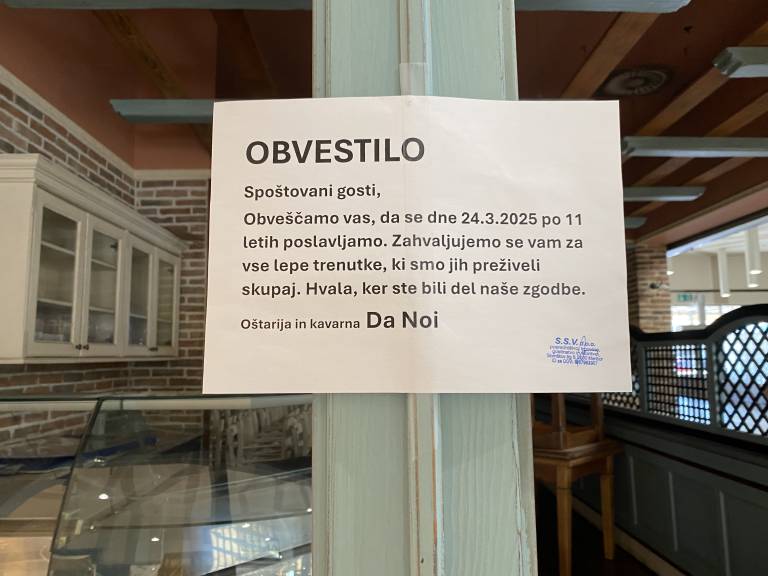 »Spoštovani gosti, obveščamo vas, da se dne 24. 3. 2025 po 11 letih poslavljamo. Zahvaljujemo se vam za vse lepe trenutke, ki smo jih preživeli skupaj. Hvala, ker ste bili del naše zgodbe. Oštarija in kavarna Da Noi.«