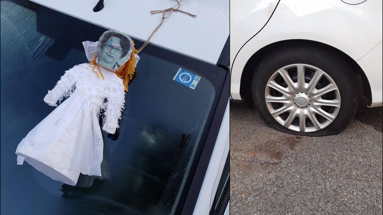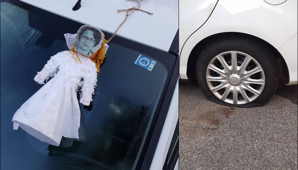 Poleg prerezanih pnevmatik, je bila na vrvico in na kamen, ki je bil na strehi avtomobila, privezana lutka. Njen obraz oziroma obraz županske kandidatke pa je bil okrvavljen oziroma imel rdeče sledi, vrvica pa je bila namotana okoli vratu lutke.