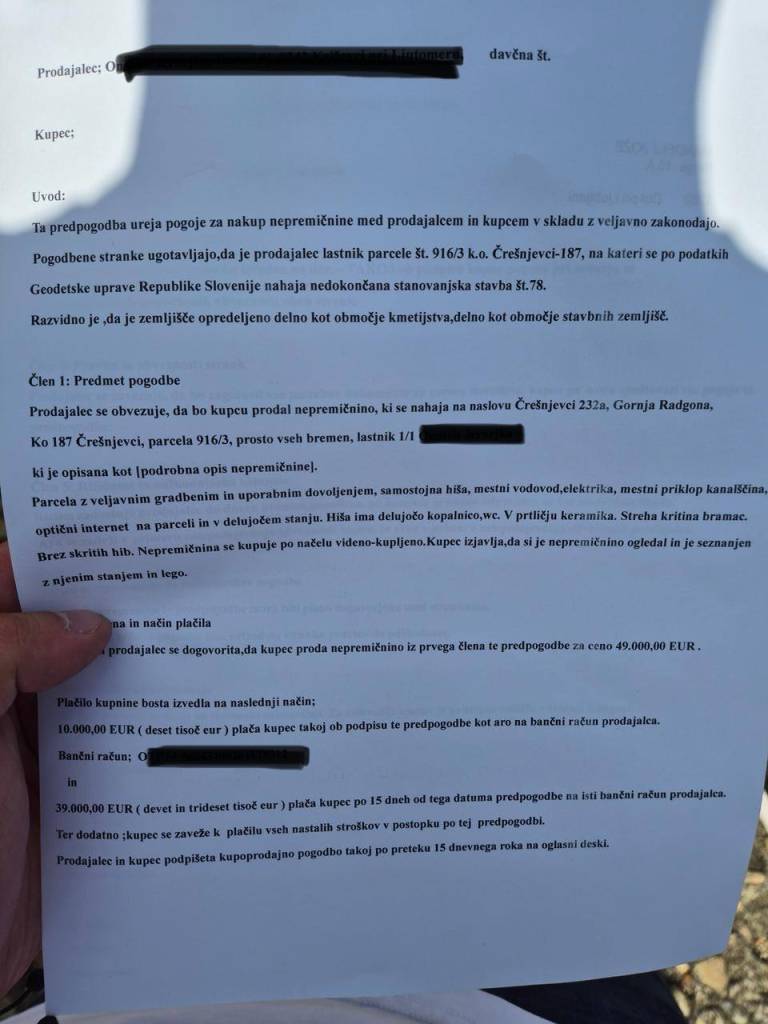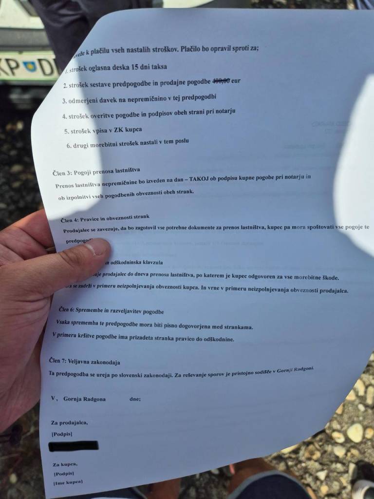 Zapletlo naj bi se, ko je lastnik zahteval 10.000 evrov are. Po besedah bralca je imel pripravljeno pogodbo, a je hkrati omenil, da bi denar lahko sprejel tudi v gotovini – brez kakršnegakoli dokazila o plačilu.