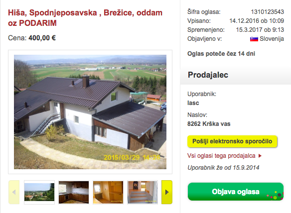 Na spletnem oglasniku Bolha.com se je te dni pojavil oglas, ki je zaradi načina prodaje stanovanjske hiše pritegnil nemalo pozornosti. Lastnik hiše v okolici Brežic, natančneje v Velikih Malencah, bi namreč 100 kvadratnih metrov veliko hišo resnim in mirnim najemnikom kar podaril. A le po dvanajstih letih mesečnega najema v višini 400 evrov. Kar pomeni, da bi pomeznik v dvanajstih letih za, po besedah lastnika, povsem opremljeno in prenovljeno hišo odštel 57.600 evrov.