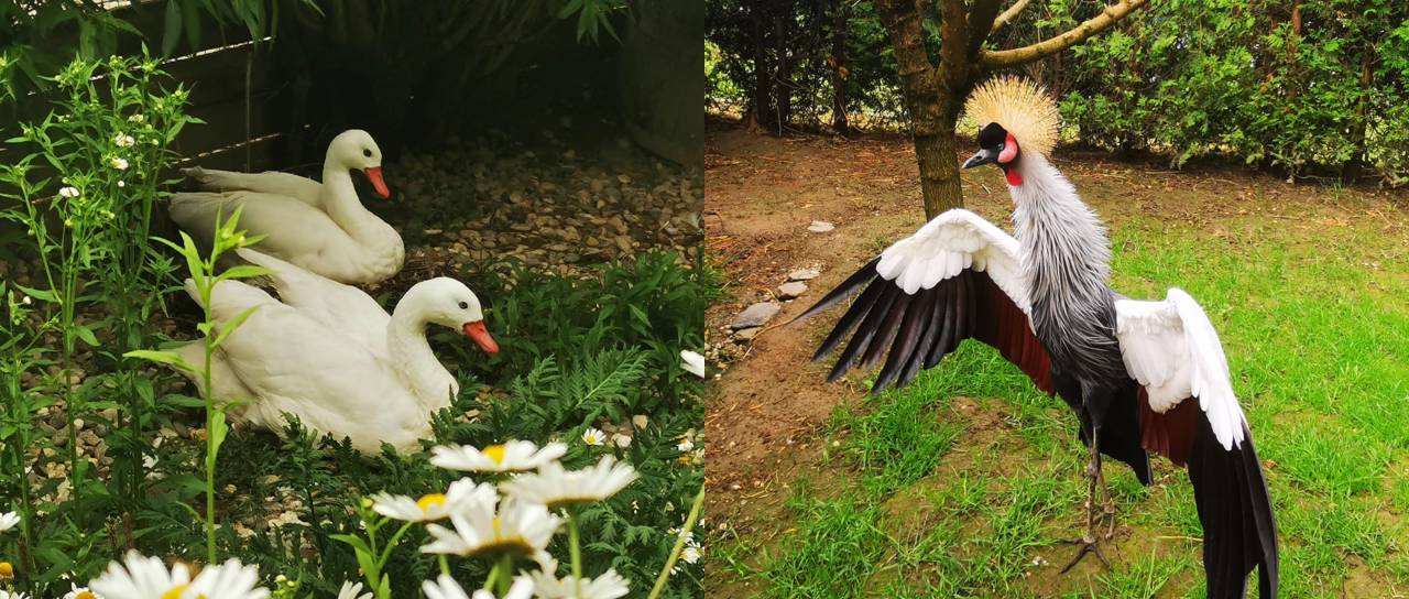 V parku lahko obiskovalci občudujejo kar enajst vrst žerjavov, poleg njih lahko spoznajo tudi različne redke vrste sov, gosi in rac; ne manjkajo niti labodi, orli, pavi, pisani fazani, prepelice, pegatke, noji, emuji, nanduji, pa tudi poljski zajčki in osliček.