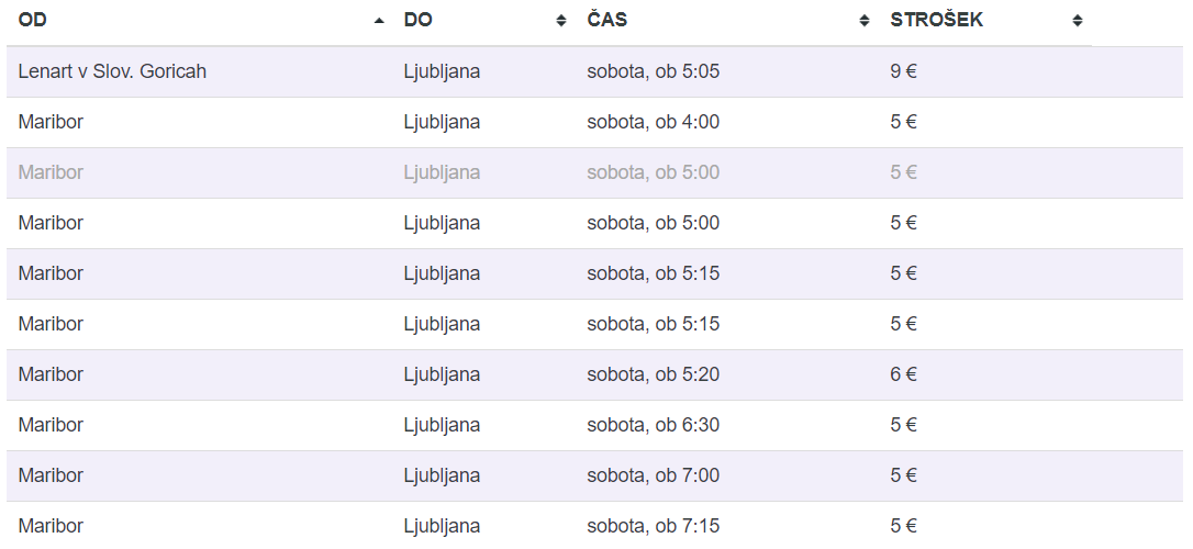 Za soboto, ki večkrat velja za manj obetavno, je bilo samo do 8. ure zjutraj moč najti več prevoznikov, ki peljejo do Ljubljane, težava pa ga ni najti niti za nazaj - ta je na voljo skoraj vsako uro.