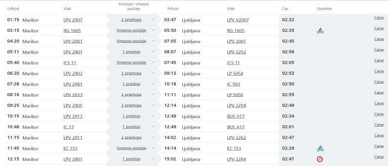 K sreči je tukaj še ICS vlak (InterCity Slovenija), ki prvi zjutraj pelje ob 5.40 in vas na ljubljanski železniški postaji odloži 15 minut pred osmo. Potovalni čas tako obsega zgolj dve uri in pet minut, medtem ko naslednji odpelje iz Maribora šele ob 10.48.
