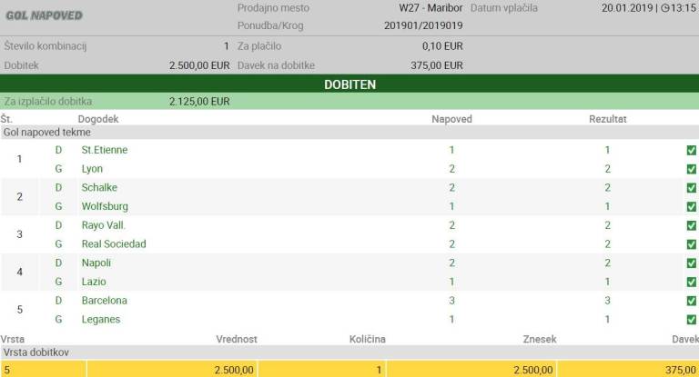 Kot je razvidno iz stavnega listka, je bil na enem izmed prodajnih mest v Mariboru minuli vikend vplačan stavni listek z gol napovedjo. Za resnično minimalni vložek (10 centov) je Mariborčan zadel gol napoved za vseh pet tekem in odnesel za dve povprečni plači dobitka.