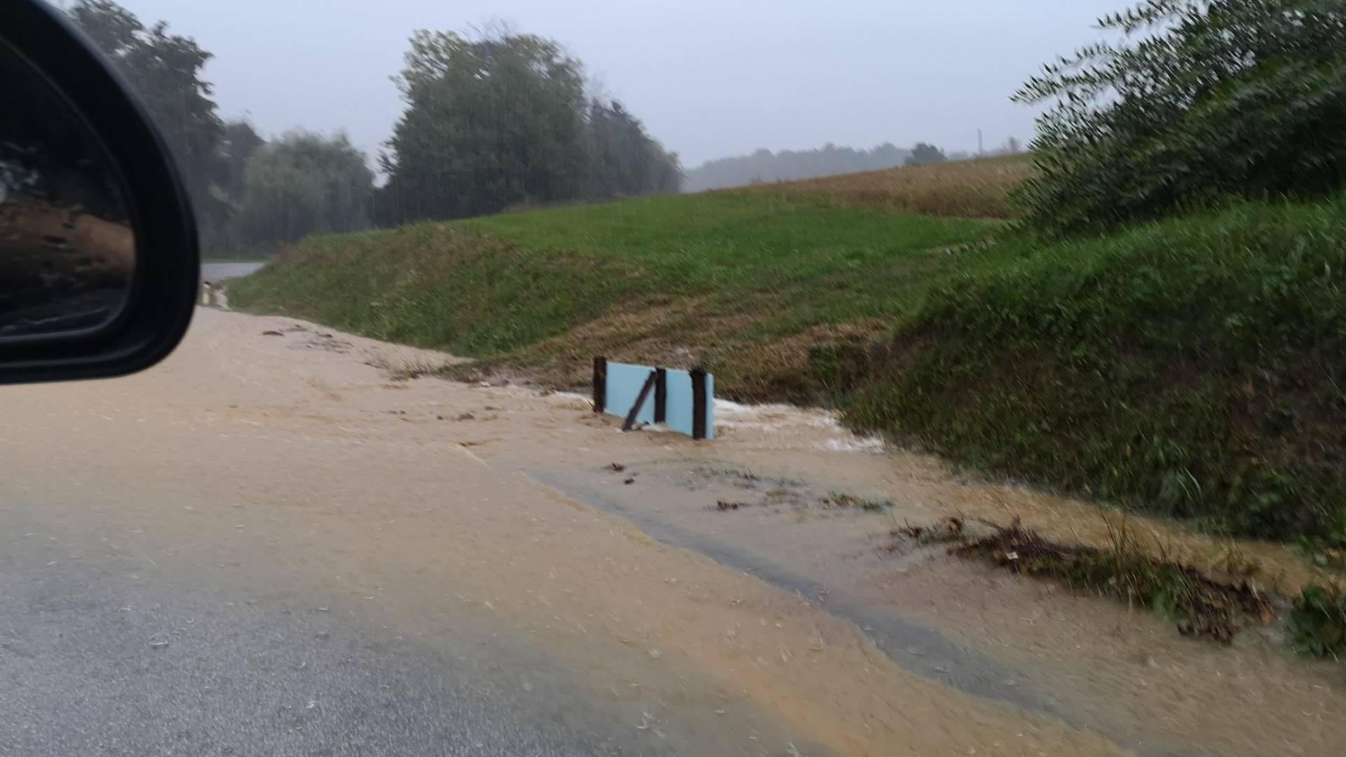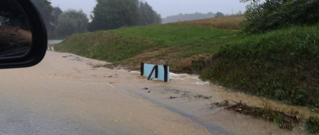 Na cesto na Meži v občini Dravograd močan dež okoli 19.25 nanosil večjo količino zemlje, ki je ovirala promet. Cestišče so očistili dežurni delavci VOC Celje. O dogodku so bile obveščene pristojne službe.