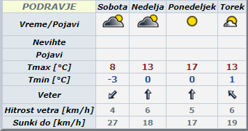 V nedeljo bo sicer sprva pretežno oblačno, na vzhodu bo ponekod zjutraj in dopoldne megla. Čez dan se bo oblačnost trgala. V ponedeljek bo delno jasno, zjutraj bo po nekaterih kotlinah megla, ki se lahko pojavi tudi ob morju.
