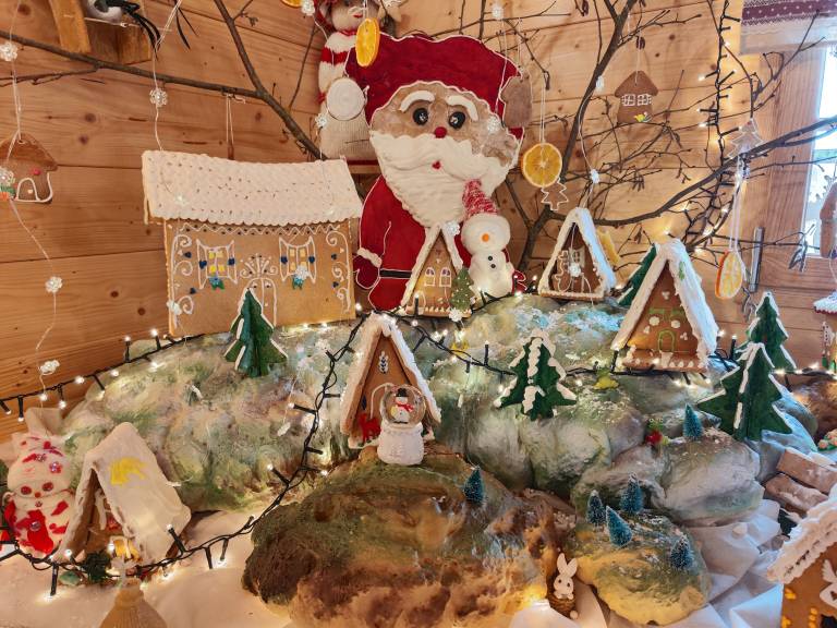 »Pri nas imamo razstavljene medene hiške, ki so narejene vse iz medenega testa in tako smo se letos šesto leto odločili, da naredimo pa tudi razstavo za naše obiskovalce in jih povabimo v našo medeno vas,« nam pokaže Dragica Tigeli.