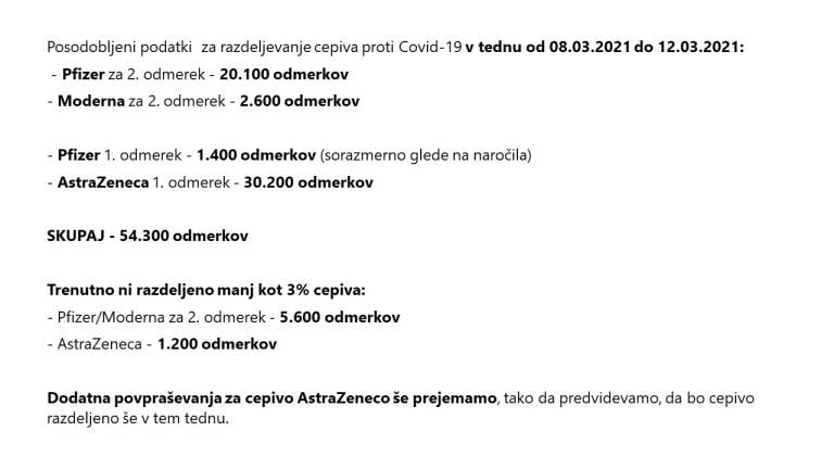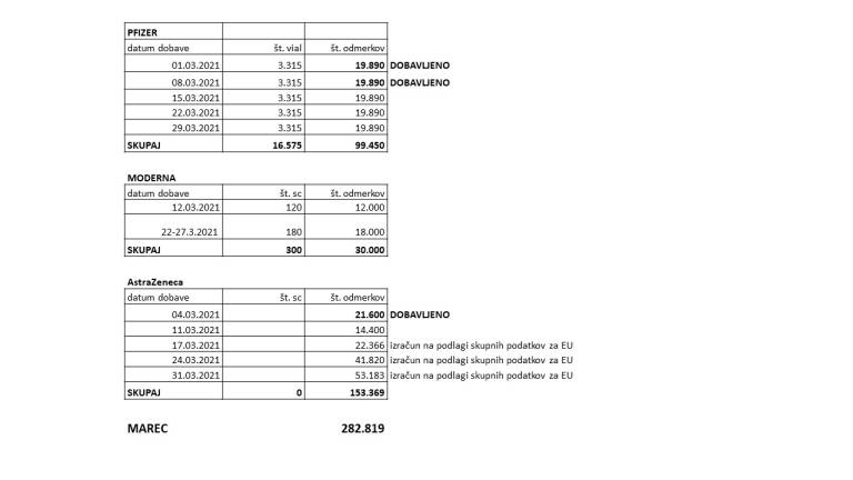 »V marcu bomo skupaj prejeli 99.450 odmerkov cepiva Pfizer, 30.000 odmerkov cepiva Moderna in po izračunih še 153.369 odmerkov cepiva AstraZeneca. V mesecu marcu bomo tako v Sloveniji prejeli 282.819 odmerkov cepiva,« je dejal.