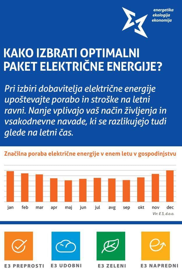 Podjetje E 3, energetika, ekologija, ekonomija, d.o.o. je edini dobavitelj električne energije v Sloveniji s paketi, ki upoštevajo različen življenjski slog odjemalcev. Izbrati je mogoče med paketi E3 NAPREDNI, E3 ZELENI, E3 UDOBNI in E3 PREPROSTI. Vsak odjemalec lahko prek kratkega spletnega vprašalnika ugotovi, kateri paket mu najbolj ustreza.