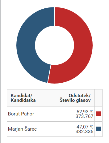 V finalu predsedniške bitke smo dobili novega starega predsednika – Boruta Pahorja, ki si je naslednji mandat izboril s 373.767 glasovi, kar je pomenilo 52,93 odstotkov vseh glasov. Medtem pa tudi Marjan Šarec ni prav dosti zaostajal s 47,07-odstotno podporo.