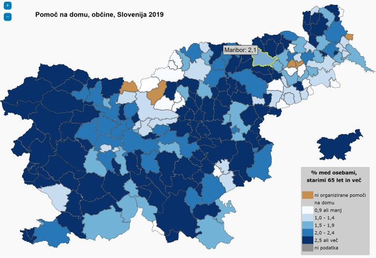Tudi delež uporabnikov pomoči na domu je bil nižji od slovenskega povprečja, stopnja umrljivosti zaradi samomora je 15 na 100.000 prebivalcev, v Sloveniji pa 19.