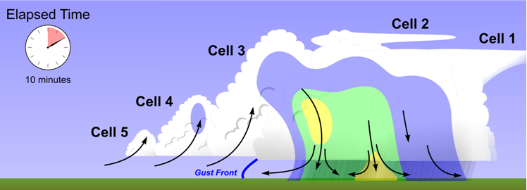 To je shema razvoja večcelične nevihte: Zaradi stekanja hladnega zraka pri tleh, se na gust fronti pojavljajo novi vzgorniki. Tako se večcelična nevihta premika in obnavlja, pojasnjuje Neurje.si.