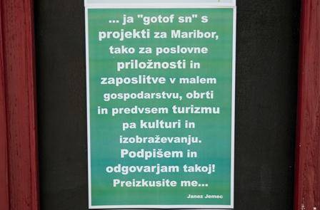 »Maribor zdaj, in to takoj,« je udaren slogan Janeza Jemca, ki pravi, da je večina prebivalcev Maribora apatičnih, saj vsi samo debatirajo po gostilnah in bifejih v praksi pa se ne zgodi nič. Prav iz tega razloga je prepričan, da je potrebno v Mariboru vzbuditi radovednost, ki bo ljudi pripravila do aktivnega razmišljanja in predvsem vključevanja v mestno politiko, ki po besedaj Jemca, to nujno potrebuje.