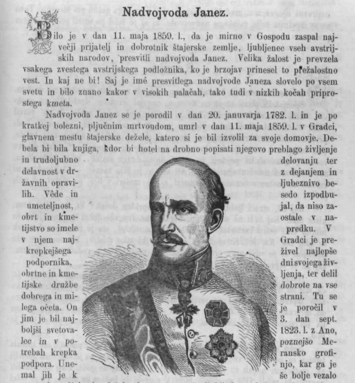 Nadvojvoda Janez Habsburško-Lotarinški, ki je bil ljudsko imenovan kot nadvojvoda Janez, je bil avstrijski nadvojvoda in feldmaršal, rojen v Firencah leta 1782, svojo pot pa je zaključil leta 1859 v Gradcu.