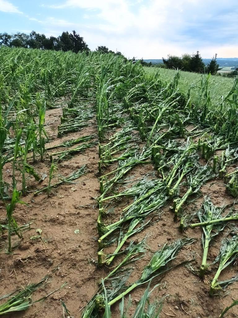 »Kar ni stolkla toča, je polomil veter,« je ob fotografije njive po ujmi zapisal kmet iz Svete Ane v Slovenskih Goricah.
