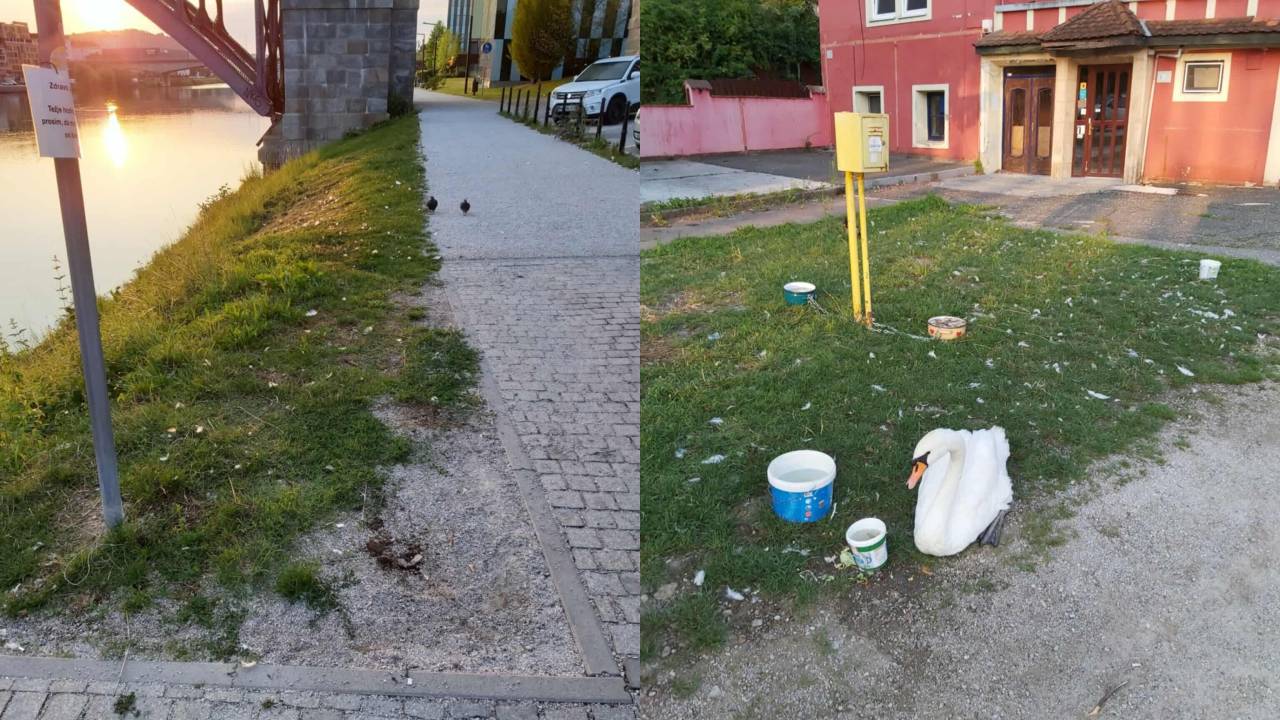 Invalidnemu labodu na Lentu znova nagajajo, nekdo je ukradel ograjo, ki mu jo je postavila občina.