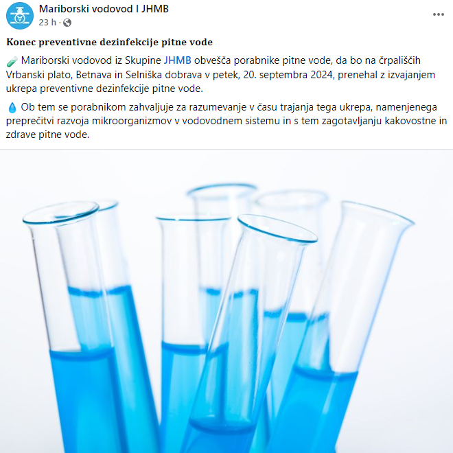 Dezinfekcija pitne vode je potekala na celotnem območju Mestne občine Maribor, Občine Ruše ter Občine Selnica ob Dravi, sedaj pa so iz Mariborskega vodovoda sporočili, da bodo na črpališčih Vrbanski plato, Betnava in Selniška dobrava v petek, 20. septembra, prenehali z izvajanjem ukrepa preventivne dezinfekcije pitne vode.