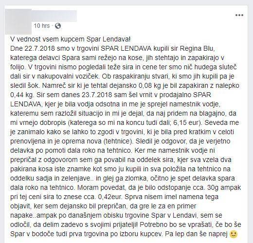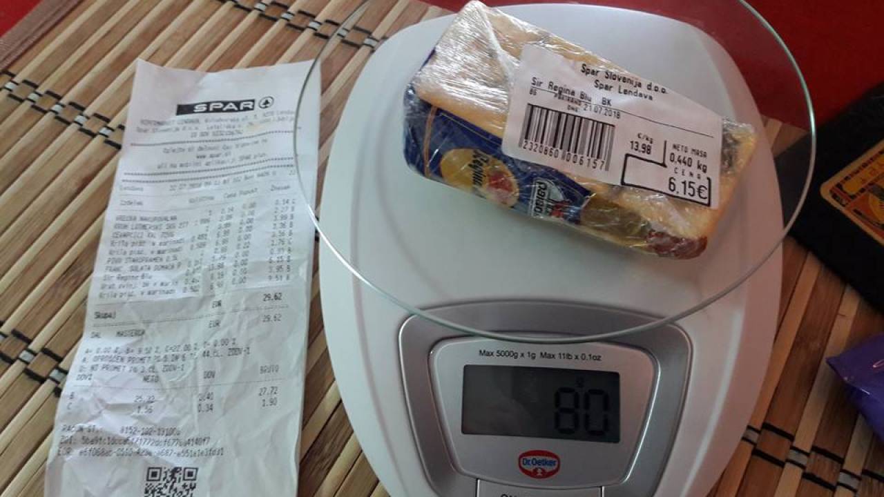 Uporabnik družbenega omrežja Facebook piše, da so v trgovini Spar Lendava včeraj kupili sir znamke Regina Blu. Gre za sir, ki ga zaposleni na oddelku s siri sami režejo na kose, stehtajo, zavijejo v folijo in opremijo s ceno. V družini teže izbranega izdelka ob nakupu niso preverili in šele ob prihodu domov jih je doletel hladen tuš.