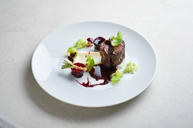 Goveji vrat s temno omako, peteršiljevo korenje pečeno z rjavim maslom, pire cvetače