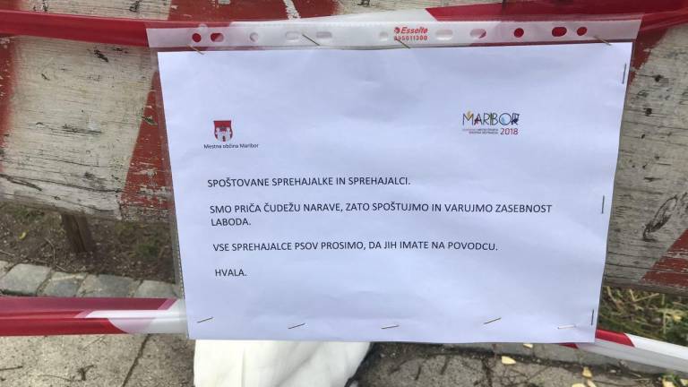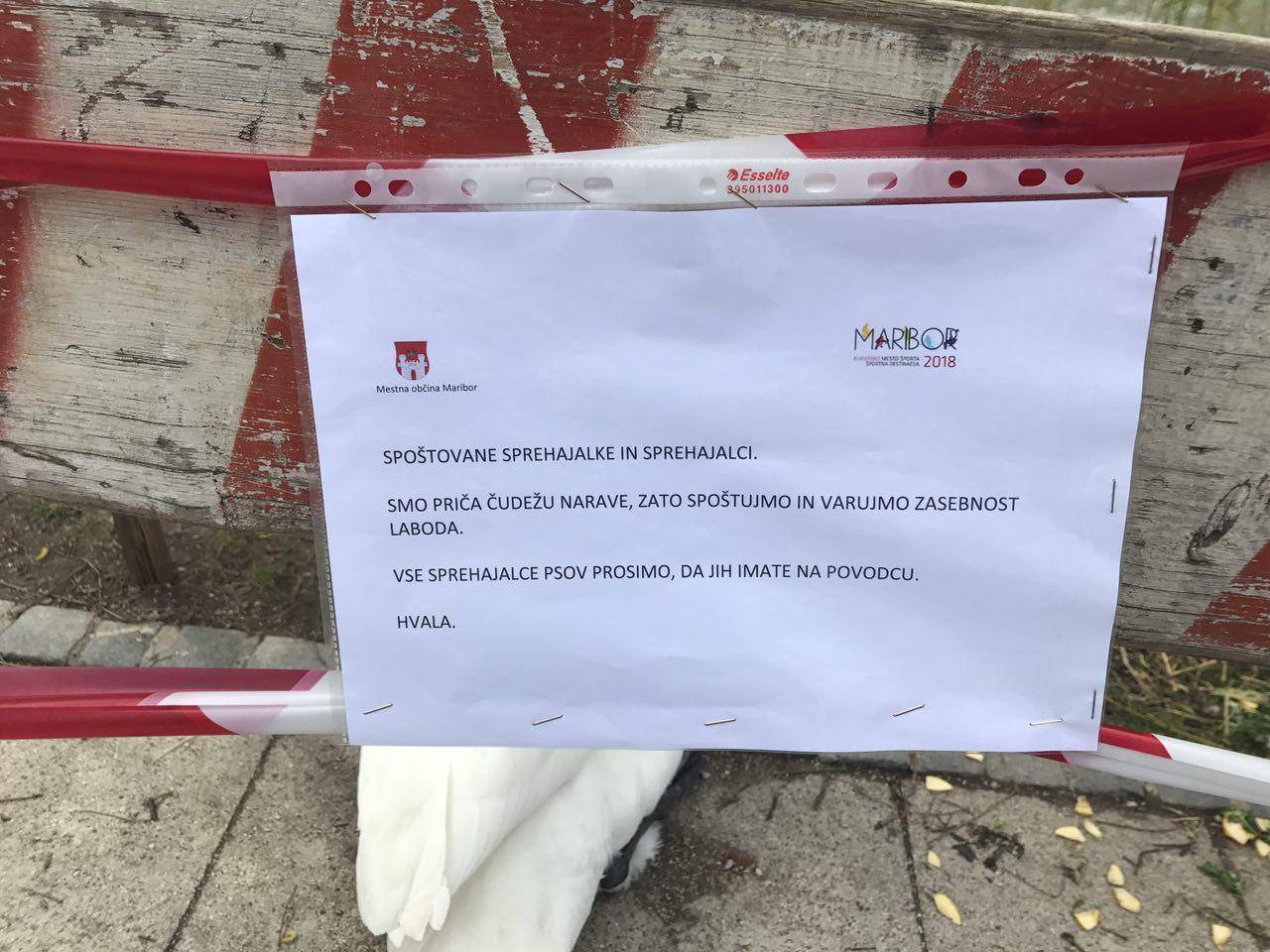 Na »informacijskih tablah«, ki so pravzaprav besedilo na več papirjih v prozornih mapah, je zapisano: »Smo priča čudežu narave, zato spoštujmo in varujmo zasebnost laboda. Vse sprehajalce psov prosimo, da jih imate na povodcu,« so na opozorilne liste zapisali pri Mestni občini Maribor.