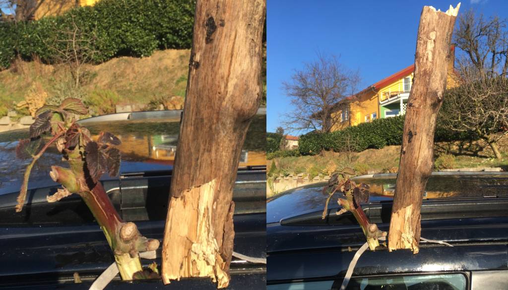 Rastlina, ki sicer zgolj spominja na odsekano vinsko trto, je bila skupaj s kolom zataknjeva za voznikovimi vrati.
