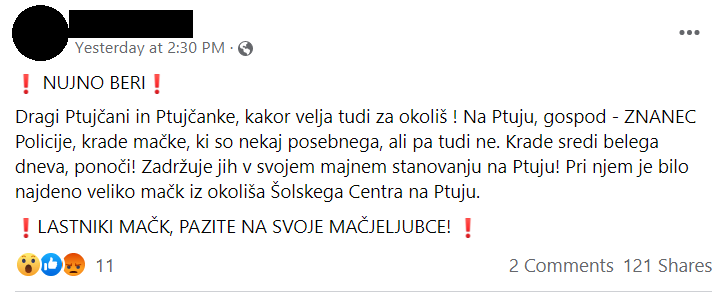 »Dragi Ptujčani in Ptujčanke, kakor velja tudi za okoliš! Na Ptuju, gospod - ZNANEC policije, krade mačke, ki so nekaj posebnega ali pa tudi ne,« se glasi zapis uporabnice.