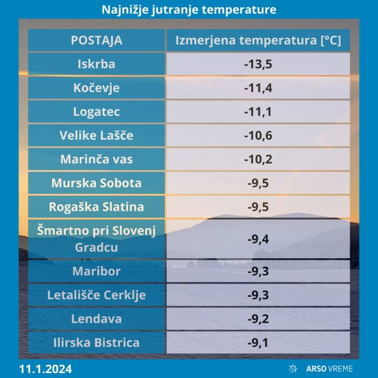 - 11. januar 2024 ob 7.07 je bilo -7,8 stopinj Celzija
