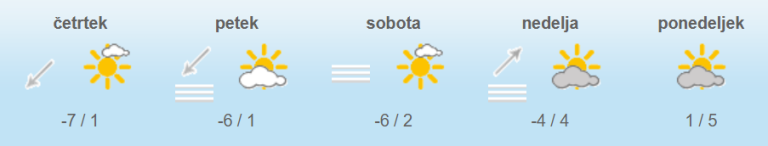 Jutri bo v zahodni in osrednji Sloveniji precej jasno, v vzhodni pa zmerno do pretežno oblačno. Najvišje dnevne temperature bodo od nič do štiri, na Primorskem ob šibki burji do deset stopinj Celzija.