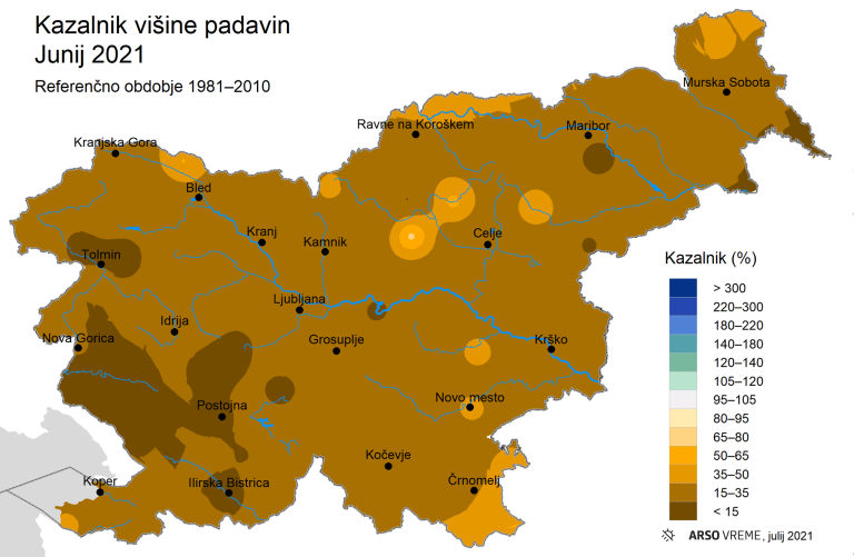 Kazalnik višine padavin na ravni države glede na referenčno obdobje 1981–2010 je znašal 24 odstotkov, kar uvršča junij 2021 med najbolj sušne vsaj od leta 1950. Pred tem je bil najbolj suh junij 2006, podobno suhi pa so bili še juniji 2019, 2003, 2000, 1977 in 2013, vsi s kazalnikom padavin pod 55 odstotkov.