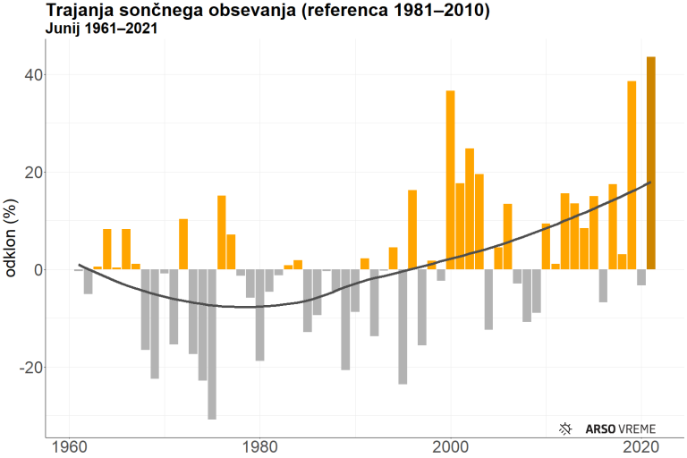 Na zgornji fotografiji vidimo relativni odklon trajanja sončnega obsevanja v junijih 1961–2021 glede na povprečje tridesetletnega referenčnega obdobja 1981–2010. Z oranžno so označeni nadpovprečno, s sivo pa podpovprečno osončeni meseci. Letošnji junij je označeno s temnejšo barvo.