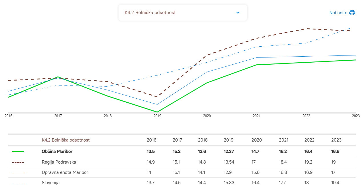 Že osmo leto zapored v Sloveniji beležimo naraščanje bolniške odsotnosti, ki se je opazno povečala v primerjavi z letom 2016, ko je Nacionalni inštitut za javno zdravje prvič objavil kazalnike na ravni občin.