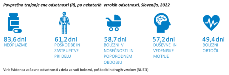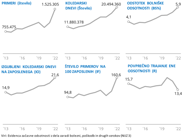 Po zadnjih dostopnih podatkih Nacionalnega inštituta za javno zdravje, ki se nanašajo na leto 2022, se je v Sloveniji večina kazalnikov bolniške odsotnosti povišala, tako je bilo v povprečju izgubljenih več koledarskih dni, odsotnih je bilo več zaposlenih, ki so bili odsotni tudi večkrat v letu, vendar pa je posamezna odsotnost trajala krajši čas, če vrednosti primerjamo z letom 2021.