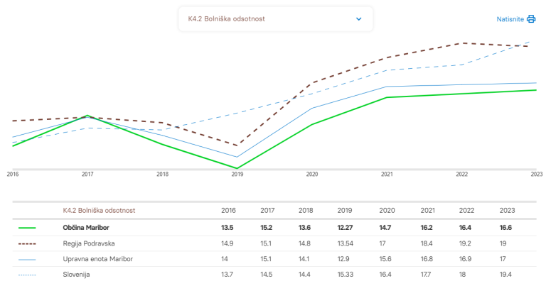 Bolniška odsotnost delovno aktivnih prebivalcev je na ravni države prejšnje leto trajala povprečno 19,4 dneva, v Mariboru pa 16,6 koledarskega dneva na leto, pri čemer torej beležimo manj bolniške odsotnosti kot na ravni države.