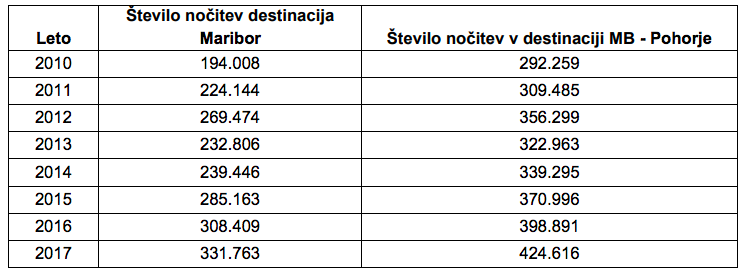 Po zbranih podatkih je lani tako turistična destinacija Maribor - Pohorje, kot tudi Mestna občina Maribor dosegla najvišje število prenočitev gostov v zadnjih treh letih. Od januarja do decembra 2017 je Maribor ustvaril 8 odstotkov več prenočitev in 14 odstotkov več prihodov gostov kot prejšnje leto v enakem obdobju.