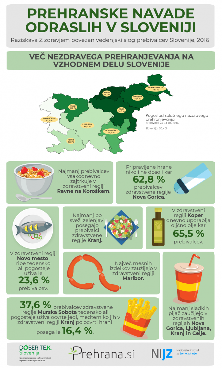 Sicer pa je raziskava Z zdravjem povezan vedenjski slog prebivalcev Slovenije leta 2016 pokazala, da se tudi v splošnem nezdravo prehranjuje približno polovica Slovencev, kar dve tretjini odraslih pa se soočata z dejavniki tveganja nezdravega življenjskega sloga, ki predstavljajo vzrok prezgodnje obolevnosti in umrljivosti.