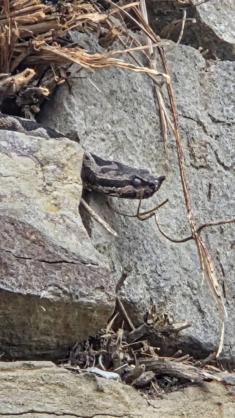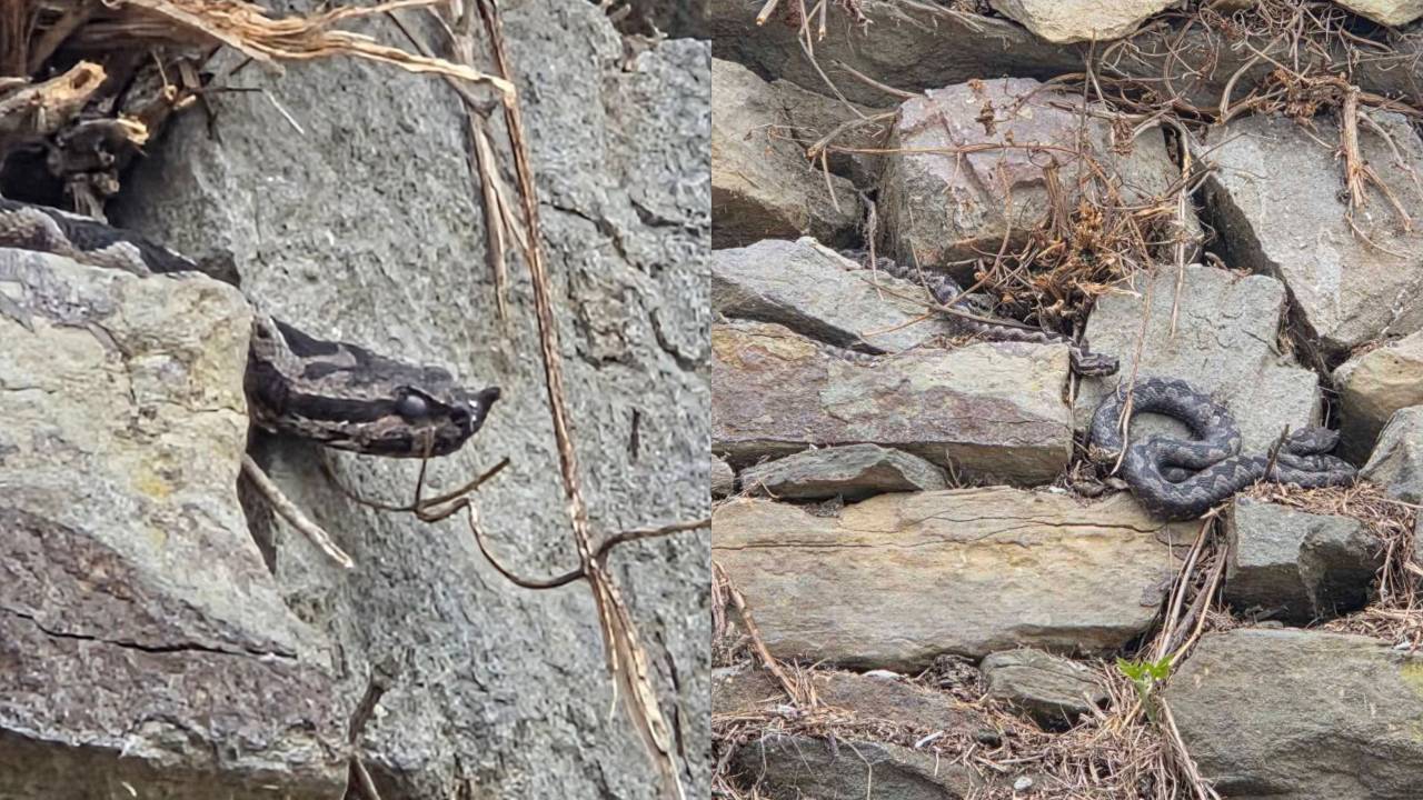Na fotografijah je videti kačo, ki se sonči med kamni na pobočju Piramide.